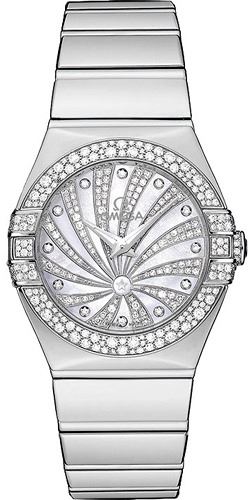 Model: 123.55.27.60.55.014 - CASE = [Material:18kt White Gold], [Case Diameter:27], [Case Back:Solid], [Water Resistant:100 Meters/330 Feet], [Crystal:Scratch Resistant Sapphire],; DIAL = [Color:White Mother Of Pearl/Diamond],; MOVEMENT = [Type:Battery Powered Quartz],; BAND = [Clasp:Deployment Buckle], [Type:18kt White Gold], (Usually ships in 2 to 4 weeks.)