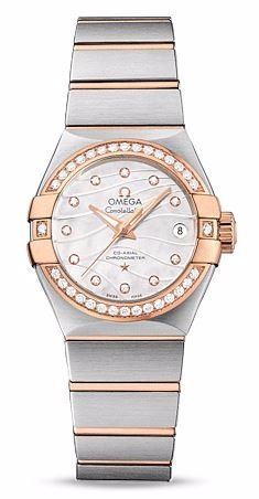 Model: 123.25.27.20.55.005 - CASE = [Material:Steel/18kt Rose Gold], [Case Diameter:27], [Bezel:Fixed set with Diamonds], [Case Back:Solid], [Water Resistant:100 Meters/330 Feet], [Crystal:Scratch Resistant Sapphire],; DIAL = [Color:White Mother Of Pearl/Diamond],; MOVEMENT = [Type:Battery Powered Quartz],; BAND = [Clasp:Deployment Buckle], [Type:Steel/18kt Rose Gold], (Usually ships in 2 to 4 weeks.)