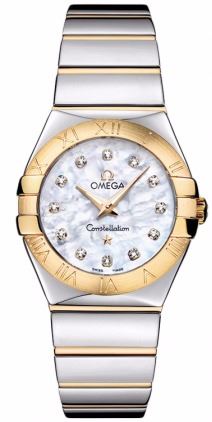 Model: 123.20.27.60.55.004 - CASE = [Material:Steel/18kt Gold], [Case Diameter:27], [Case Back:Solid], [Water Resistant:100 Meters/330 Feet], [Crystal:Scratch Resistant Sapphire],; DIAL = [Color:White Mother Of Pearl/Diamond],; MOVEMENT = [Type:Battery Powered Quartz],; BAND = [Clasp:Deployment Buckle], [Type:Steel/18kt Gold], (Usually ships in 2 to 4 weeks.)
