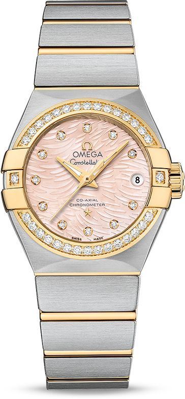 Model: 123.25.27.20.57.005 - CASE = [Material:Stainless Steel and 18kt Gold], [Case Diameter:27], [Case Thickness:9mm], [Bezel:Fixed], [Case Back:Skeleton], [Water Resistant:100 Meters - 330 Feet], [Crystal:Scratch Resistant Sapphire], DIAL = [Color:Pink Mother of Pearl with Gold Hands and Diamond Hour Markers], MOVEMENT = [Type:Automatic Chronometer], [Crown:Push In], BAND = [Clasp:Folding], [Type:Stainless Steel and 18kt Gold], (Usually ships in 2 to 4 weeks.)
