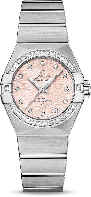 Model: 123.15.27.20.57.002 - CASE = [Material:Stainless Steel], [Case Diameter:27], [Case Thickness:9mm], [Bezel:Fixed], [Case Back:Skeleton], [Water Resistant:100 Meters - 330 Feet], [Crystal:Scratch Resistant Sapphire], DIAL = [Color:Pink Mother of Pearl with Silver Hands and Diamond Hour Markers], MOVEMENT = [Type:Automatic Chronometer], [Crown:Push In], BAND = [Clasp:Folding], [Type:Stainless Steel], (Usually ships in 2 to 4 weeks.)
