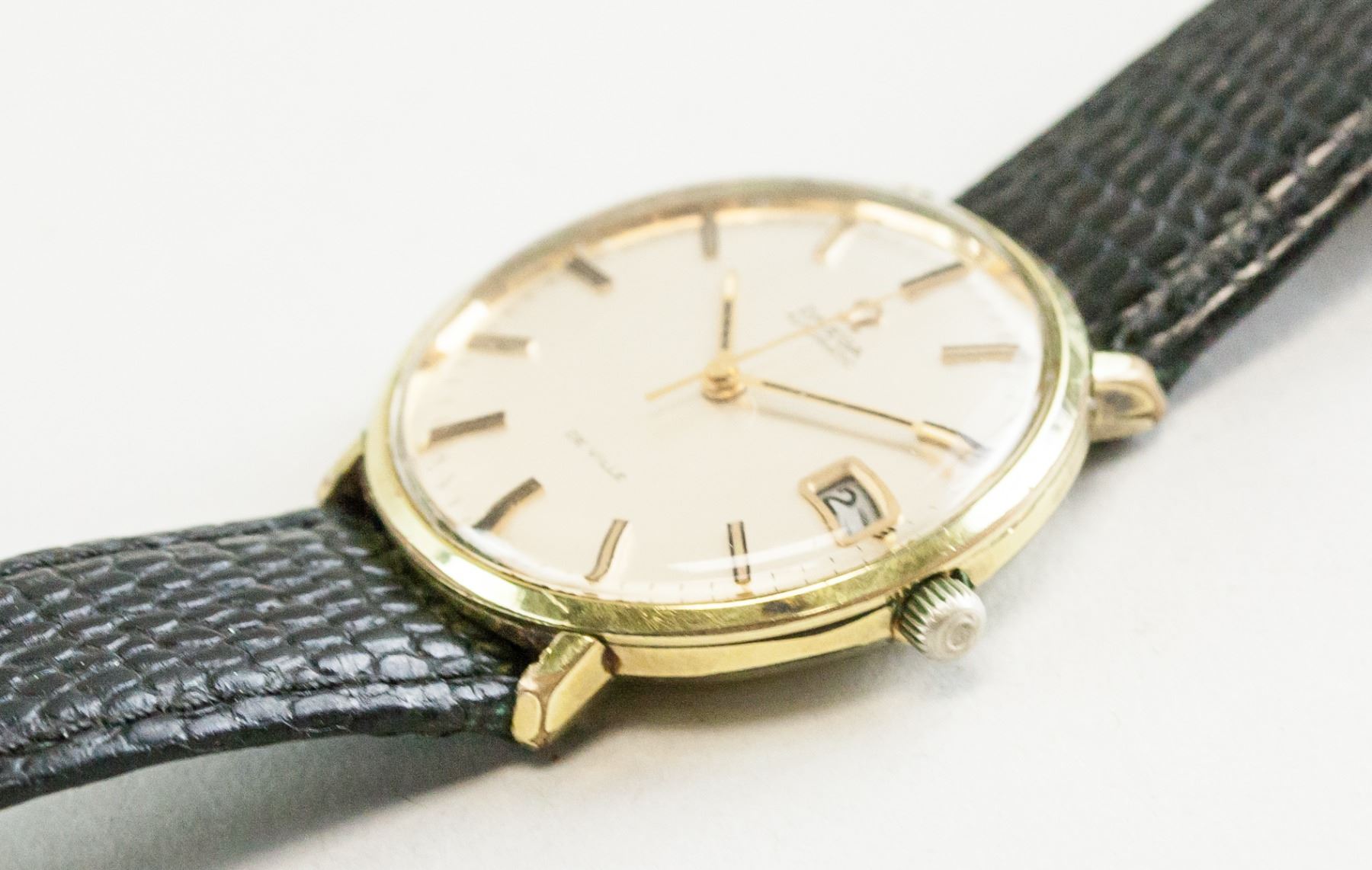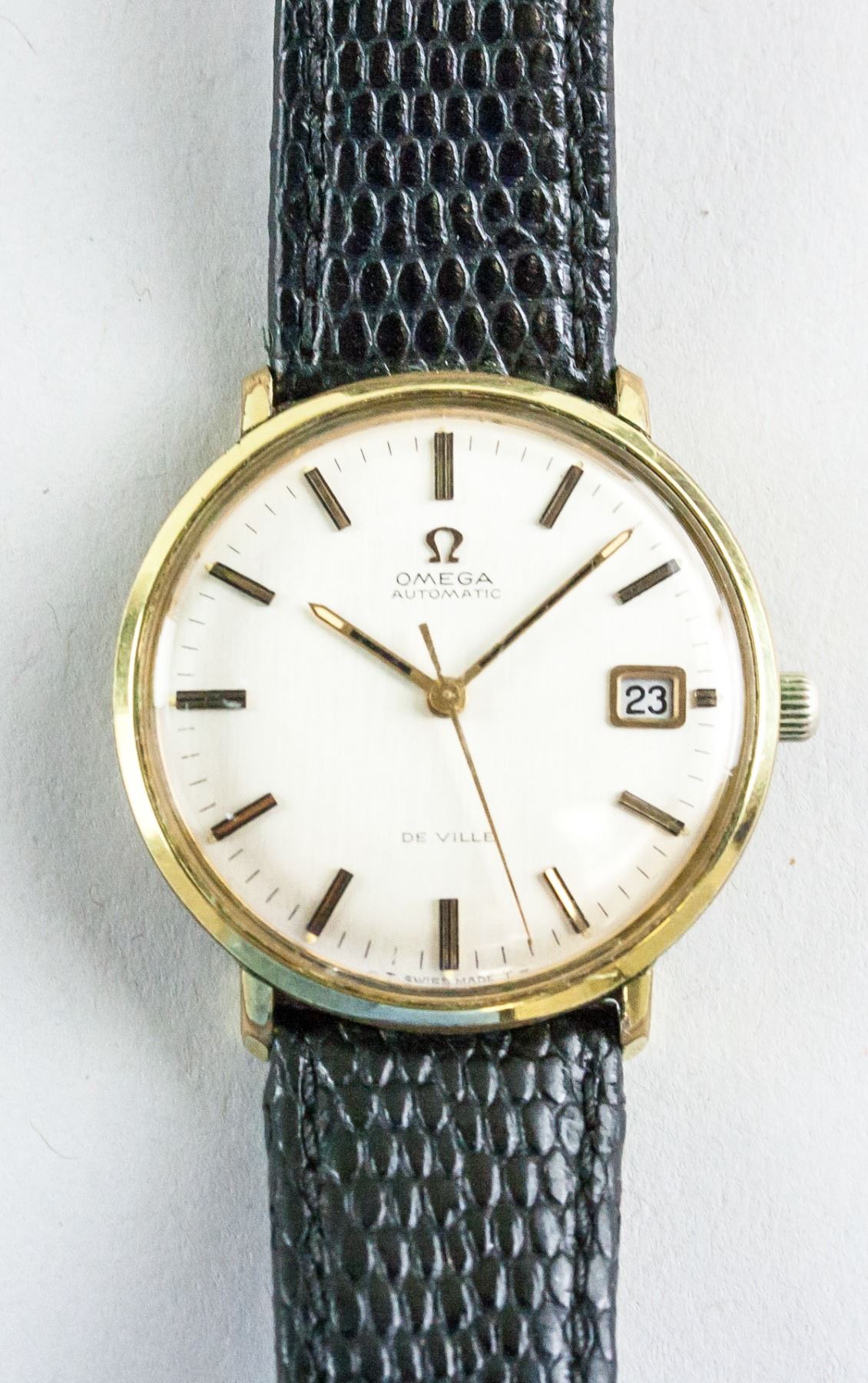 Gold men's watch. OMEGA AUTOMATIC and DE VILLE on watch face at the 12 and 6 positions respectively.