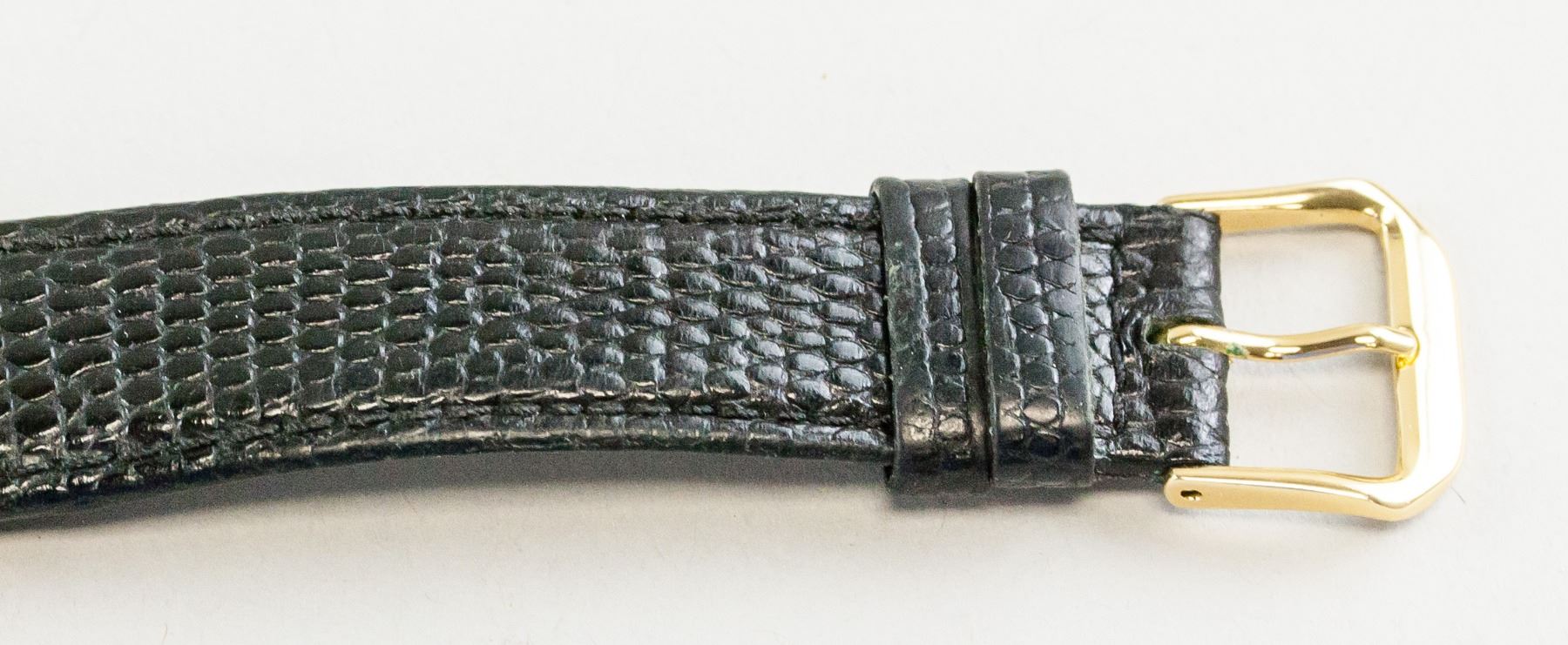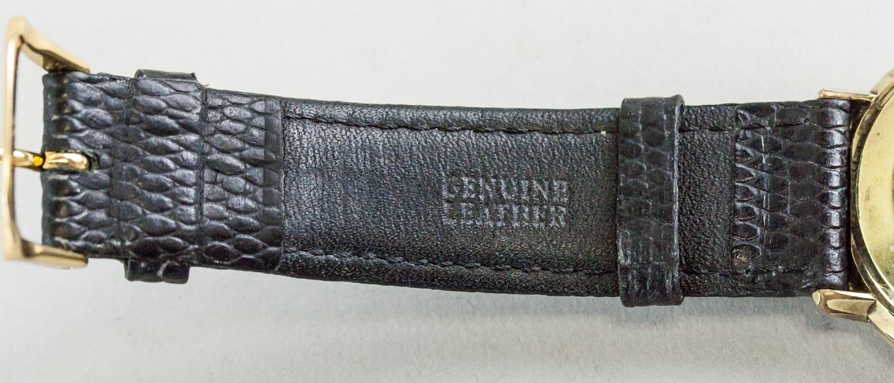 With date function. WATER PROOF stamped on back of watch. Q#106033 TOO1 106 stamped on back of watch. GENUINE LEATHER stamped on watch strap. Scratches on back of watch. Diameter: 3.5 cm, 37 grams.