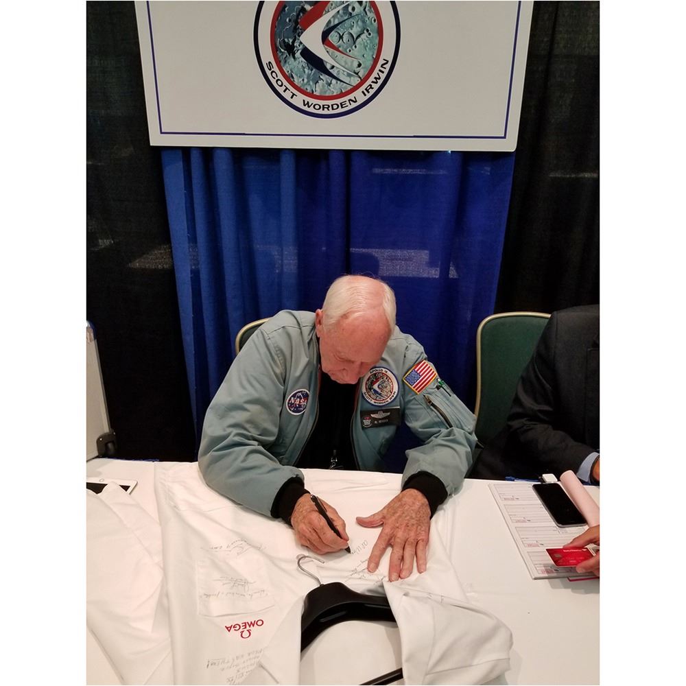 This project first started when Eric, the Omega watch tech, was introduced to Tom Stafford and Gene Cernan on November 8, 2014. Eric was wearing his Omega lab coat as a representative of the Omega Watch Co. Tom and Gene volunteered to sign the coat and thus began the collection of autographs on the lab coat featuring astronauts and ground support people who used an Omega Speedmaster during their missions. Eric also had a NASA Silver Snoopy Award winner, David Cisco, autograph the coat since Omega was awarded a Silver Snoopy for their efforts during Apollo 13. Eric has also assisted various astronauts in repairing their Speedmasters over the years, so this is a rare artifact that connects Omega and spaceflight.