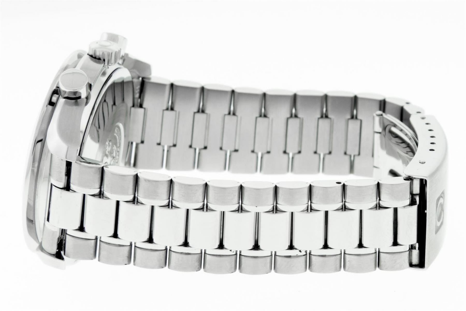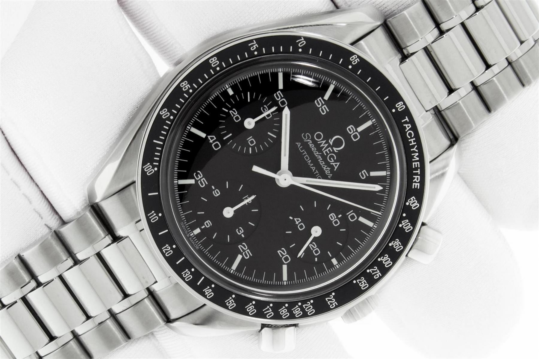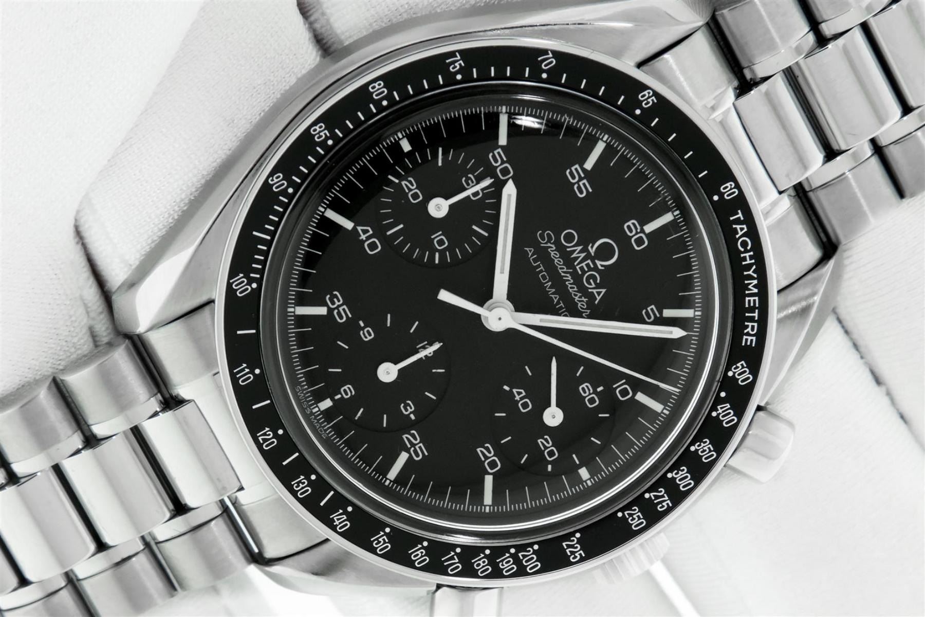 One Mens Omega Stainless Steel Speedmaster Chronograph, Polished bright with Satin Finish, This Watch Has Been Serviced & Electronically Tested, Stainless Steel Case: 39mm, Stainless Steel Crown. Bezel: Stainless Steel Tachymeter Bezel, Crystal: Sapphire Crystal. Hands: White Markers, Movement: Omega Swiss Automatic Movement Cal 1143 Eta 2890A2. 3 Sub Chronograph Dials: Seconds Subdial, 30 Minute and 12 Hour Dial: Omega Black Dial, Window: 3 O'Clock Position Date Display, Functions: Chronograph. Model : Speedmaster. Condition: G-6 Extra Fine. Bracelet: Stainless Steel Omega Bracelet, Bright Polish & Satin Finish. 7.0 Inch Length, Adjustable. Stainless Steel Omega Folding Clasp. This Watch Has Been Serviced Time Tested And Is In Excellent Condition.