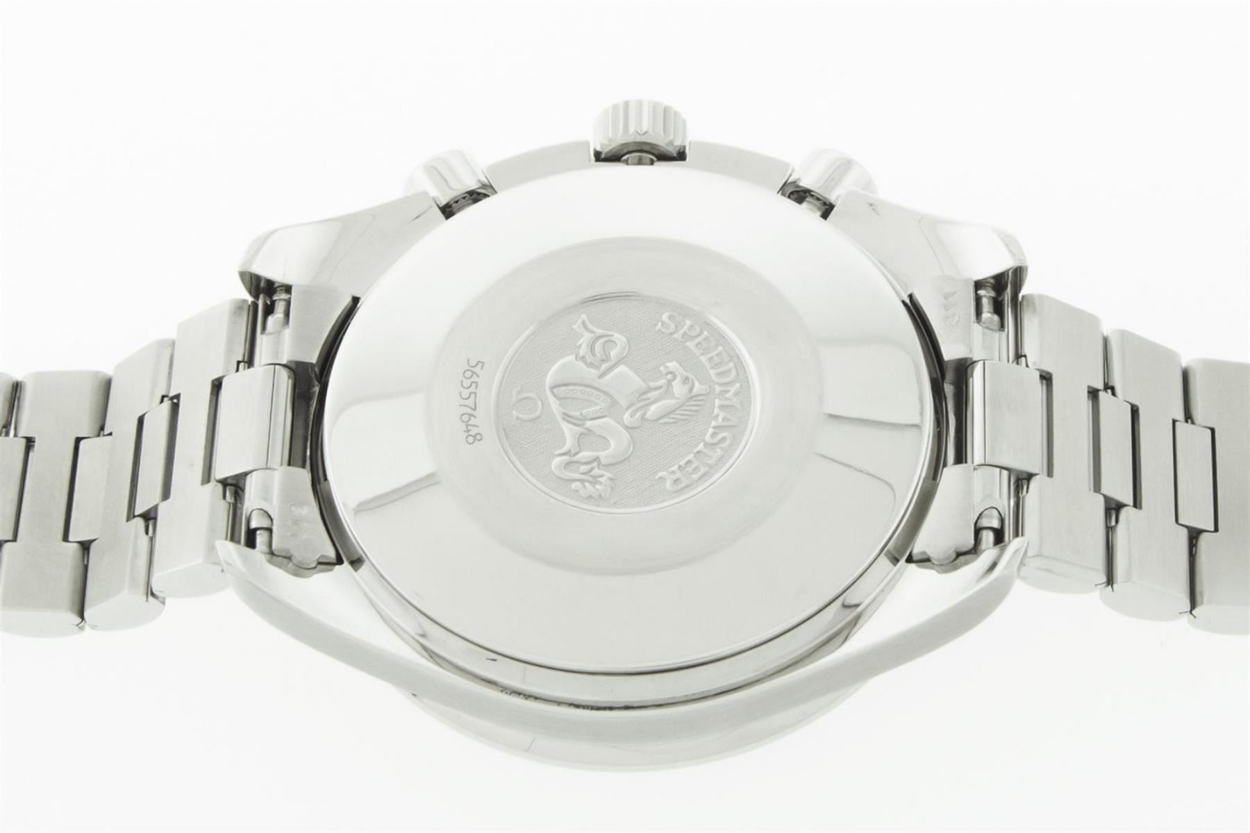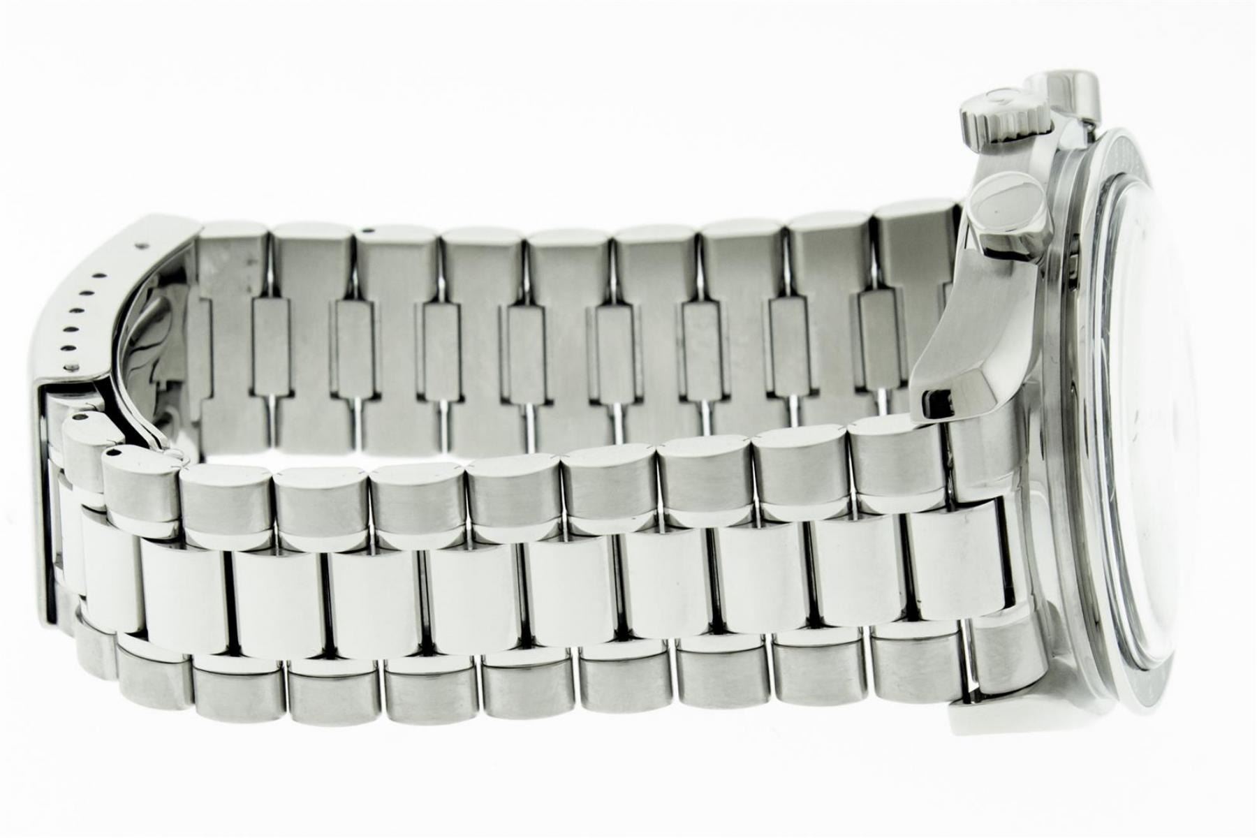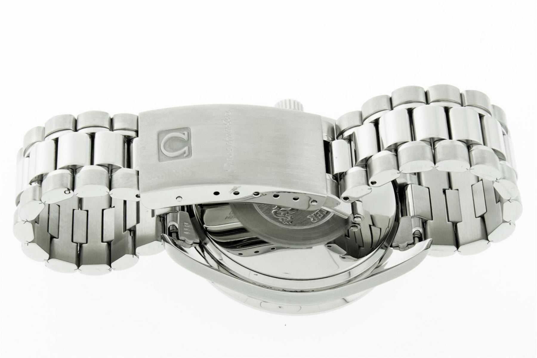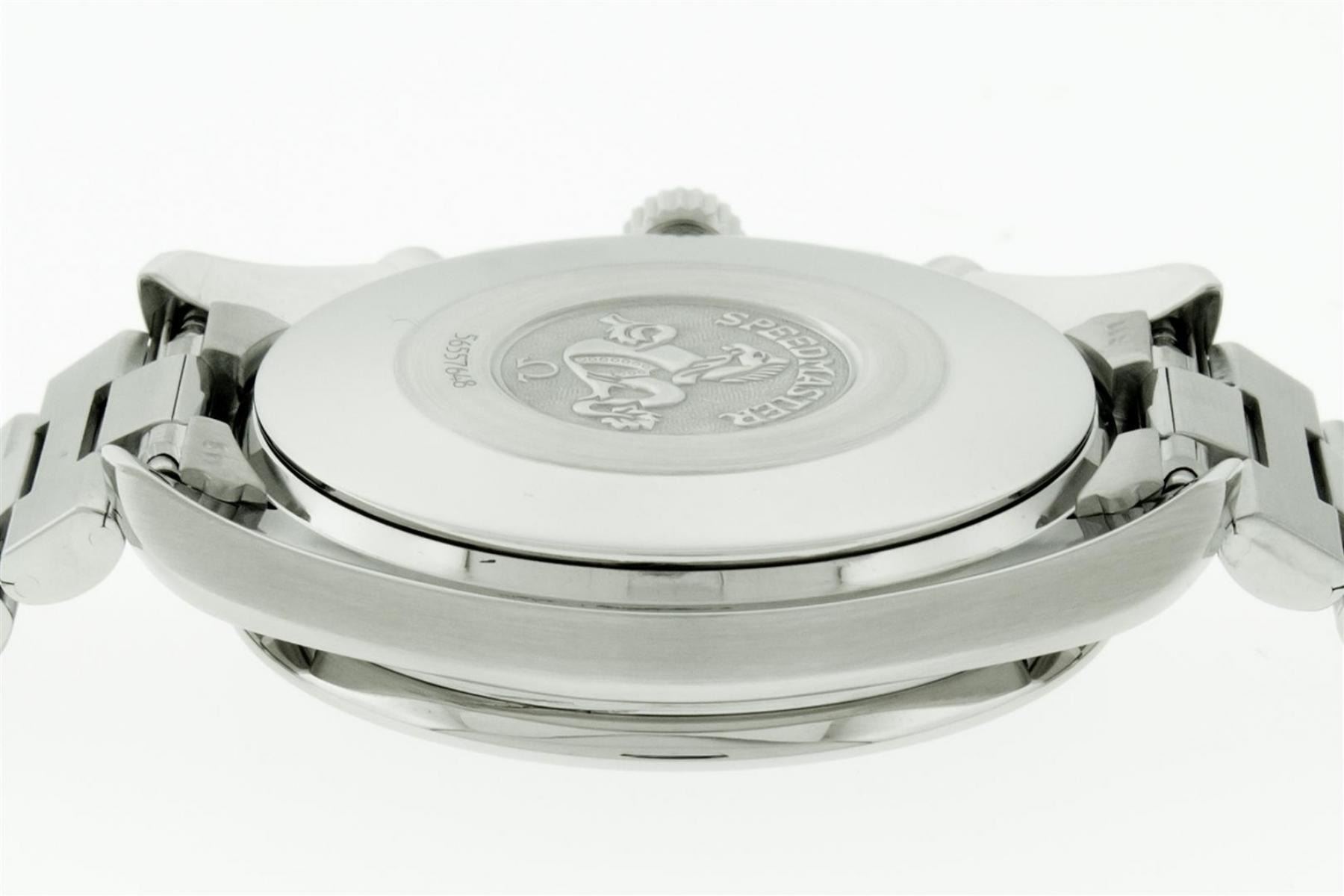 One Mens Omega Stainless Steel Speedmaster Chronograph, Polished bright with Satin Finish, This Watch Has Been Serviced & Electronically Tested, Stainless Steel Case: 39mm, Stainless Steel Crown. Bezel: Stainless Steel Tachymeter Bezel, Crystal: Sapphire Crystal. Hands: White Markers, Movement: Omega Swiss Automatic Movement Cal 1143 Eta 2890A2. 3 Sub Chronograph Dials: Seconds Subdial, 30 Minute and 12 Hour Dial: Omega Black Dial, Window: 3 O'Clock Position Date Display, Functions: Chronograph. Model : Speedmaster. Condition: G-6 Extra Fine. Bracelet: Stainless Steel Omega Bracelet, Bright Polish & Satin Finish. 7.0 Inch Length, Adjustable. Stainless Steel Omega Folding Clasp. This Watch Has Been Serviced Time Tested And Is In Excellent Condition.