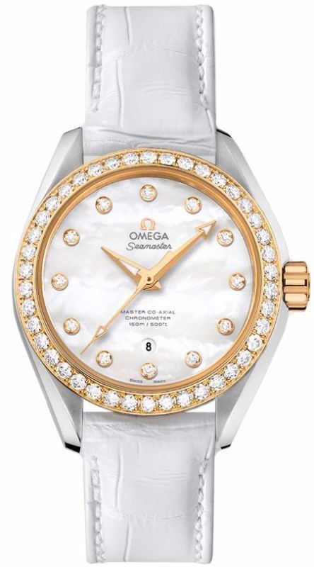 Model: 231.28.34.20.55.004 - CASE = [Material:Stainless Steel and Yellow Gold], [Case Diameter:34], [Bezel:Fixed with Diamonds], [Case Back:Skeleton], [Water Resistant:150 Meters - 500 Feet], [Crystal:Scratch Resistant Sapphire],; DIAL = [Color:Natural Mother of Pearl with Diamonds],; MOVEMENT = [Type:Automatic], [Crown:Screw Down],; BAND = [Clasp:Folding], [Type:White Alligator - Crocodile Leather], (Usually ships in 2 to 4 weeks.)