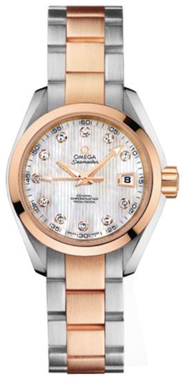 Model: 231.20.30.20.55.001 - CASE = [Material:Brushed and Polished 18Kt Rose Gold & Stainless Steel], [Case Diameter:30], [Case Thickness:10mm], [Case Back:Transparent], [Water Resistant:150 Meters - 500 Feet.], [Crystal:Scratch Resistant Sapphire], DIAL = [Color:White Mother of Pearl with Diamond Hour Markers], MOVEMENT = [Type:Automatic Self Winding - Chronometer Omega Caliber 8520], BAND = [Clasp:Deployment Buckle], [Type:Brushed and Polished 18Kt Rose Gold & Stainless Steel], (Usually ships in 2 to 4 weeks.)