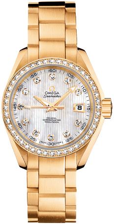 Model: 231.55.30.20.55.002 - CASE = [Material:Brushed and Polished 18k Yellow Gold], [Case Diameter:30], [Bezel:Fixed - Set with Diamonds], [Case Back:See-thru Sapphire crystal], [Water Resistant:150 Meters - 500 Feet], [Crystal:Scratch Resistant Sapphire], DIAL = [Color:Teck-White Mother of Pearl Set with 11 Diamond Hour Markers and Date at 3], MOVEMENT = [Type:Automatic Self Winding Co-Axial Chronometer with Approx. 50hr Power Reserve], [Crown:Screw Down], BAND = [Clasp:Push Button Foldover Clasp], [Type:18k Yellow Gold], (Usually ships in 1 to 2 weeks.)
