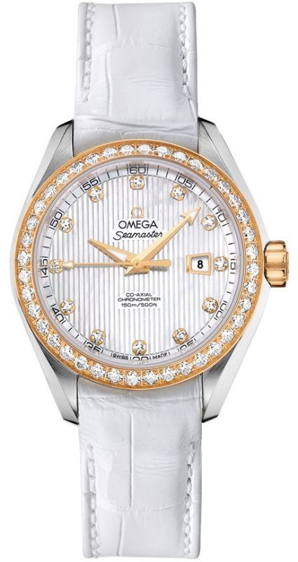 Model: 231.28.34.20.55.001 - CASE = [Material:Brushed and Polished Stainless Steel with Yellow Gold], [Case Diameter:34], [Case Thickness:12.5mm], [Bezel:Fixed Yellow Gold with Diamonds], [Case Back:See-thru Sapphire crystal], [Water Resistant:150 Meters - 500 Feet], [Crystal:Scratch Resistant Sapphire], DIAL = [Color:Mother of Pearl with Diamond Markers], MOVEMENT = [Type:Automatic Self Winding Co-Axial Chronometer with Approx. 60hr Power Reserve], [Crown:Screw Down], BAND = [Clasp:Deployment Buckle], [Type:White Crocodile Leather], (Usually ships in 2 to 4 weeks.)