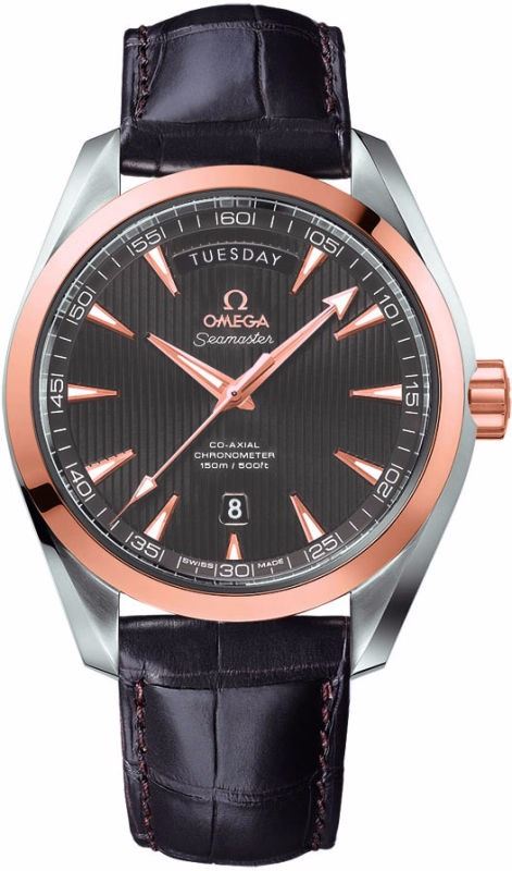 Model: 231.23.42.22.06.001 - CASE = [Material:Brushed and Polished Stainless Steel with Rose Gold], [Case Diameter:41.5], [Bezel:Fixed Rose Gold], [Case Back:See-thru Sapphire crystal], [Water Resistant:150 Meters - 500 Feet], [Crystal:Domed scratch-resistant sapphire],; DIAL = [Color:Grey with Day at 12 and Date at 6],; MOVEMENT = [Type:Automatic Self Winding Omega Cailbre 8602 Co-Axial Escapement with Approx. 55hr Power Reserve], [Crown:Screw Down],; BAND = [Clasp:Deployment Buckle], [Type:Brown Crocodile Leather], (Usually ships in 2 to 4 weeks.)