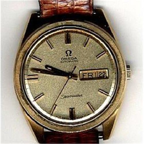Vintage Omega Automatic Seamaster Men's day date Swiss made wristwatch. The bezel is 14k GF. The back is stainless steel.<p> It comes on a patterned leather band that is marked "Kimtron Leather F3640". <p> The condition is very good to excellent. It works great. There are no scratches to the crystal or bezel. The back is clean. There appears to by some gunk on the bezel sort of wedge in next to the crystal. I only need to be cleaned but I don?t want to risk damaging it with harsh cleaner. With a watch this fabulous it is worth taking in to have it professionally cleaned. <p> It came for a prestigious Mercer Island Estate. It has obviously been well cared for.<p>