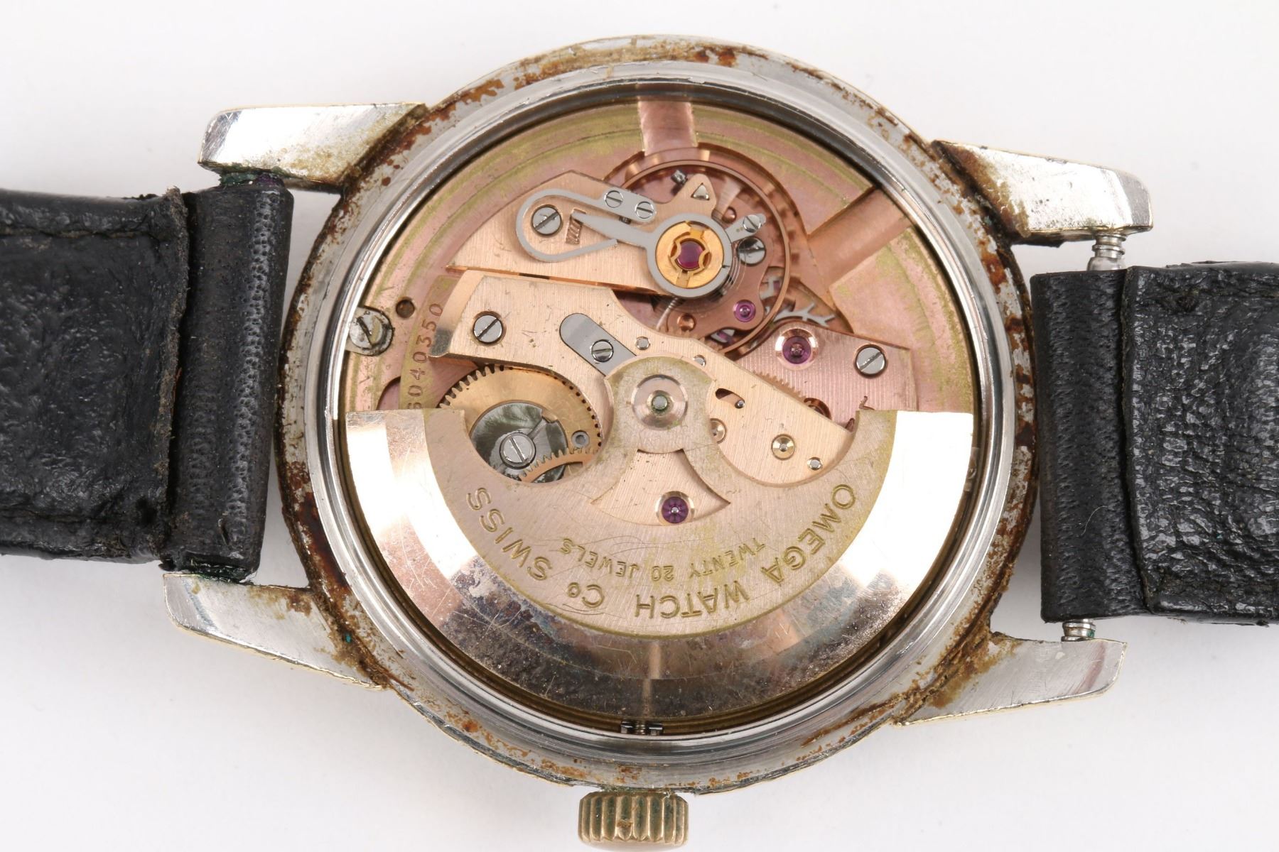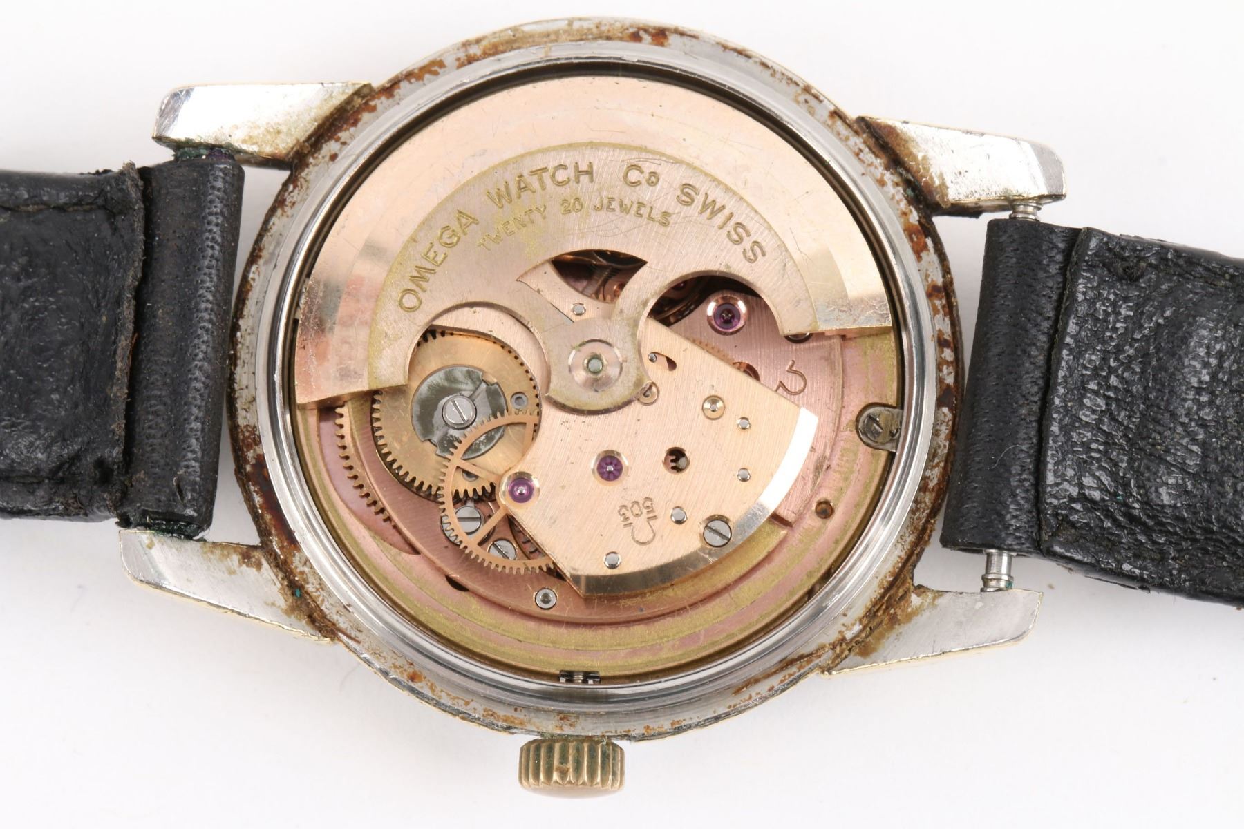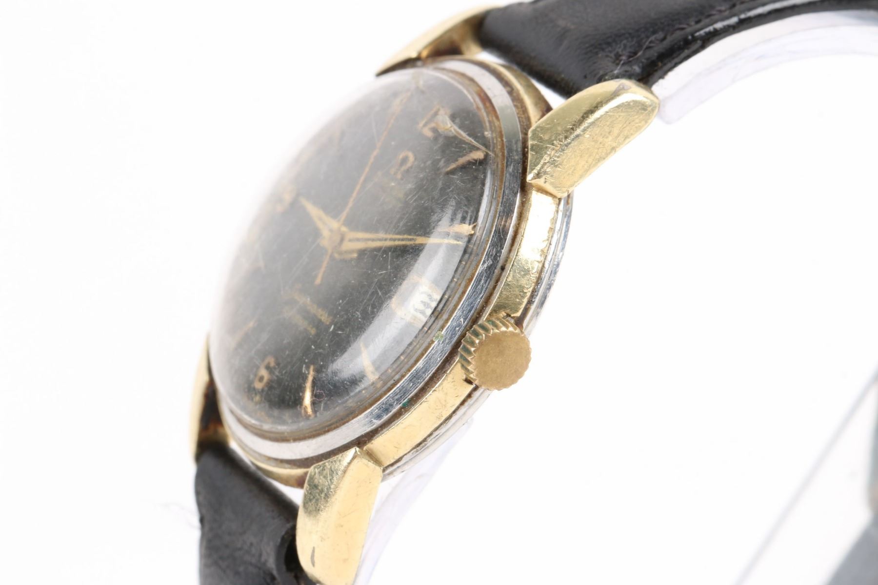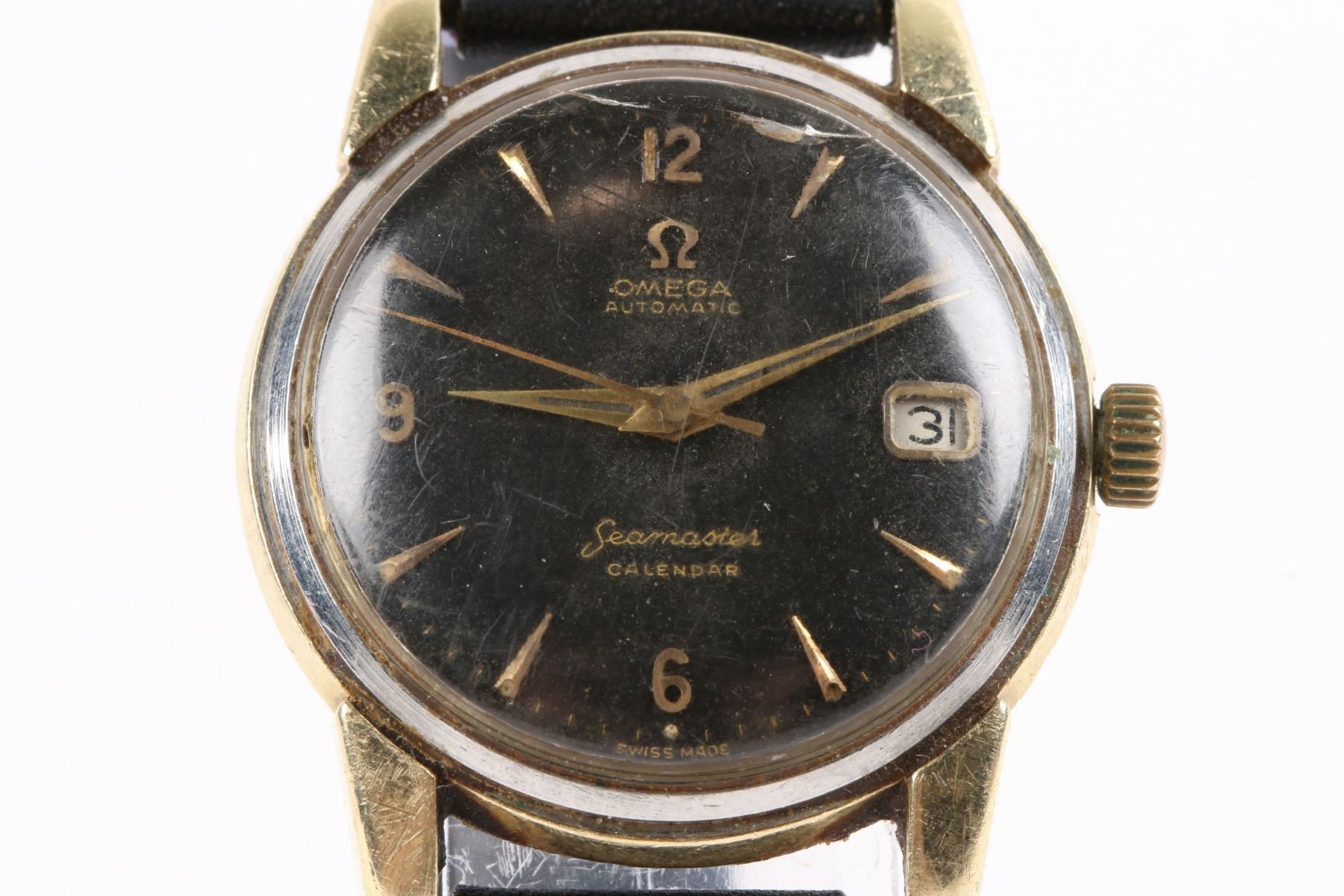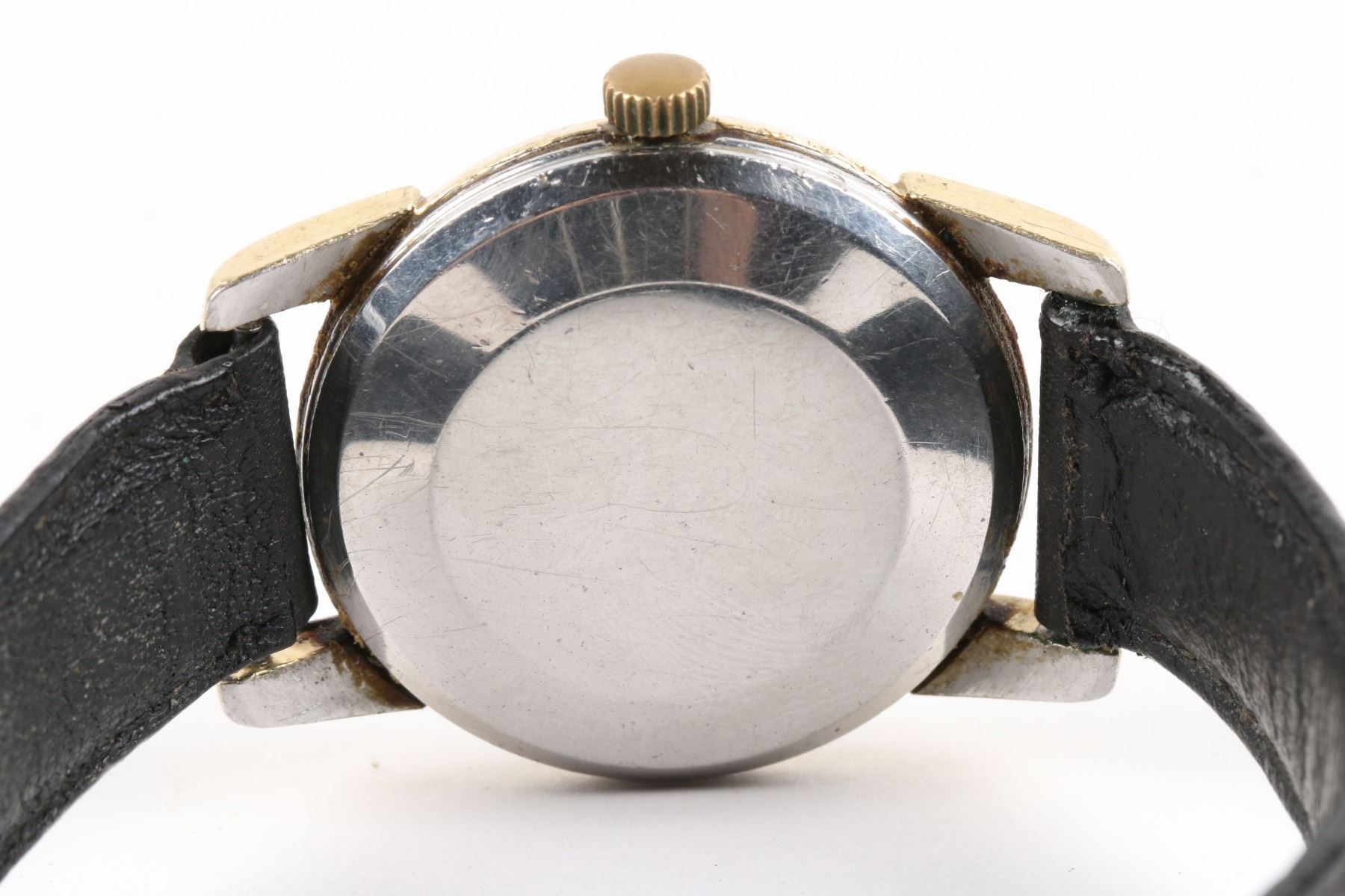 CIRCA: 1968. CASE MATERIAL: Gold Filled. DIAL DIAMETER: 30mm. BRACELET MATERIAL: Leather. MOVEMENT: Caliber 503 Automatic. FEATURES: Date. NOTES: Missing bezel. Cracked crystal. WEIGHT: 40.4g. Est. $200-300 DISCLOSURE: Watches were running at time of photography unless otherwise stated. Service history is unknown unless paperwork is provided. We cannot guarantee accuracy of any of the watches offered. "