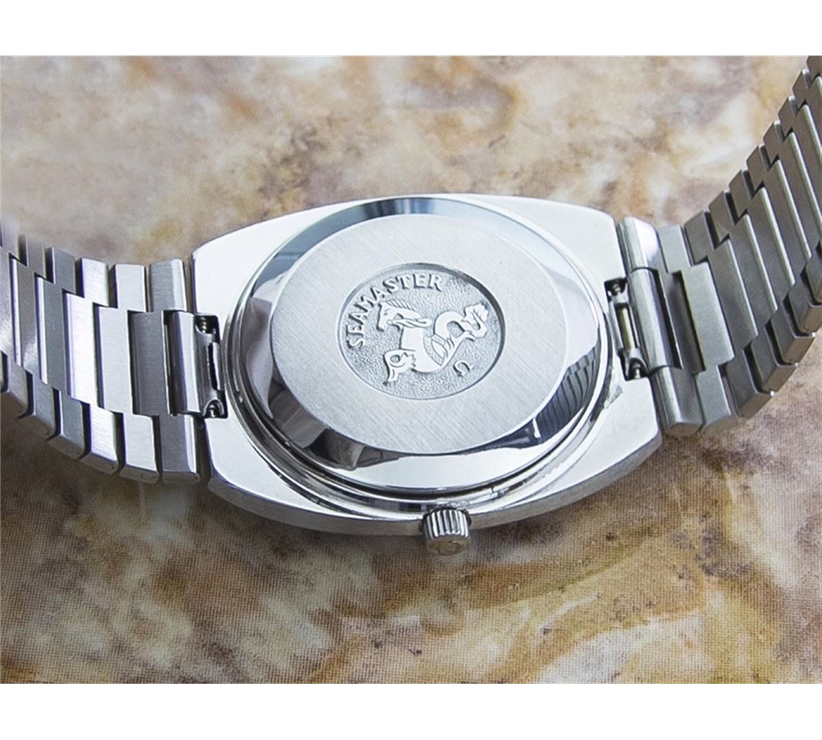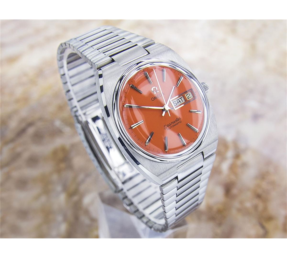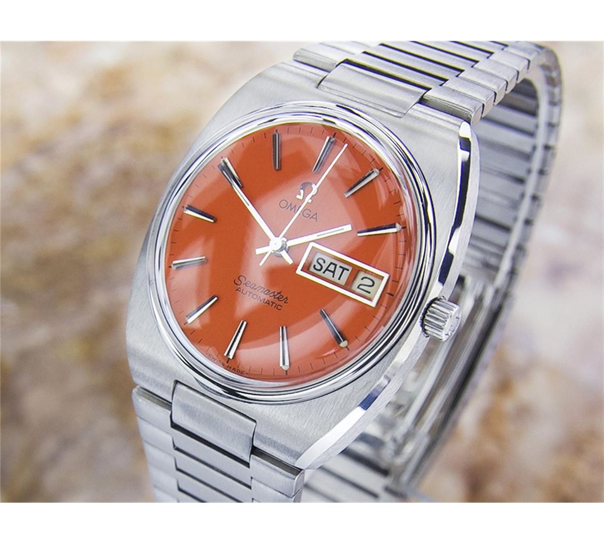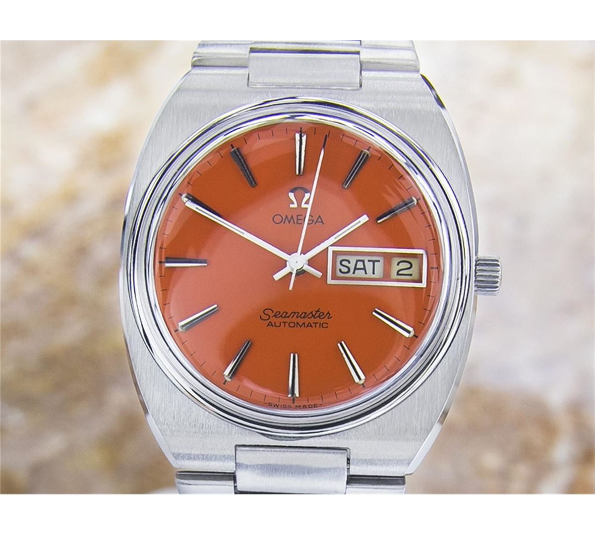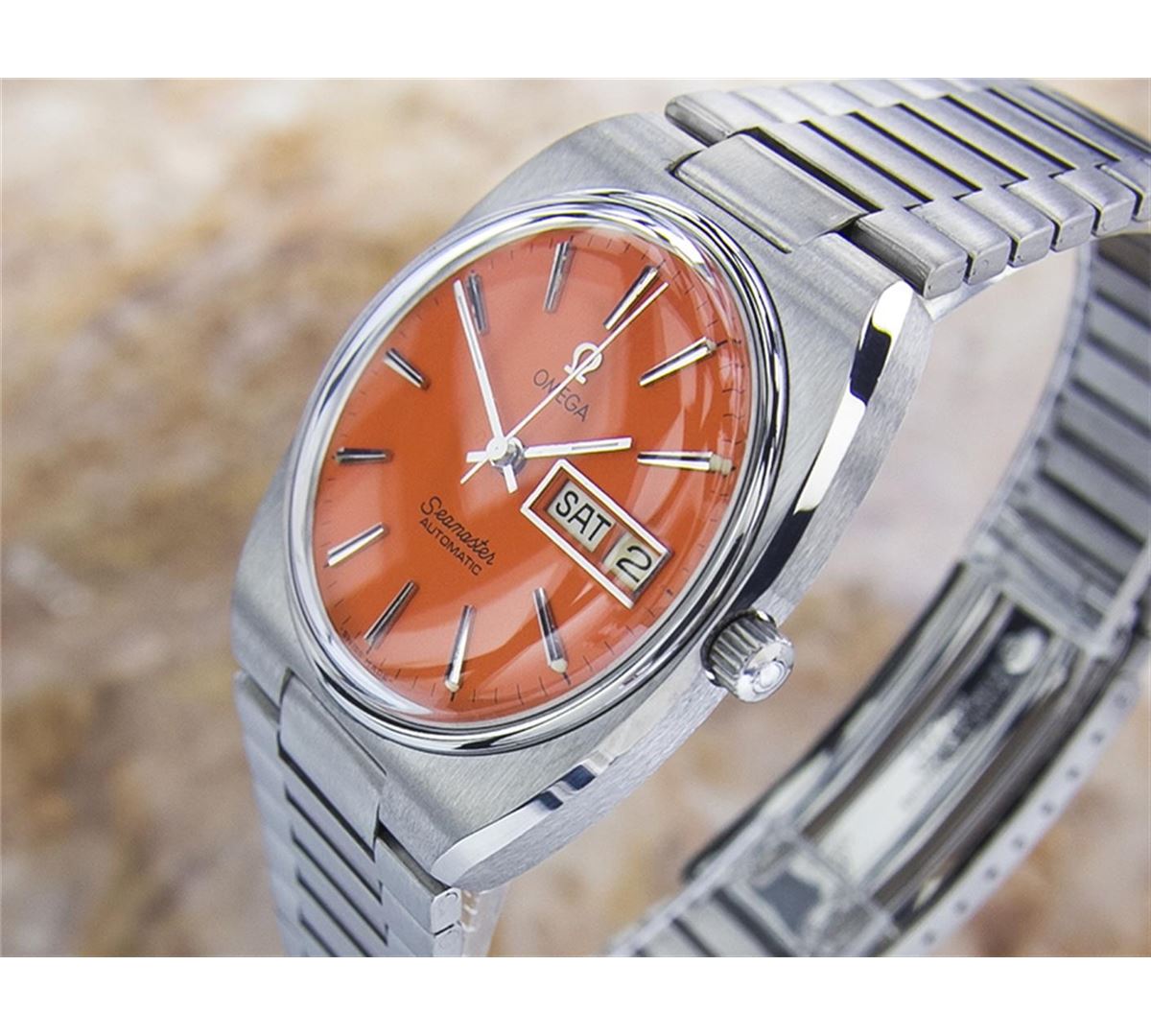 Omega Seamaster Day Date Stainless Steel Automatic Watch. Brand: OMEGA. Model: SEAMASTER. Movement: Automatic. Case Material: Stainless Steel. Crystal: ACRYLIC. Case Size: 40x35. Band: ORIGINAL Stainless Steel BRACELET.