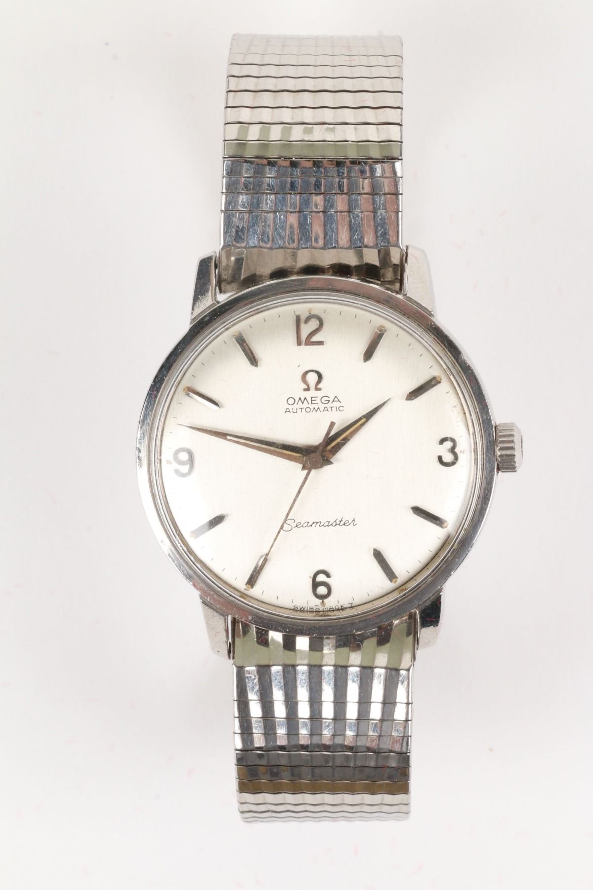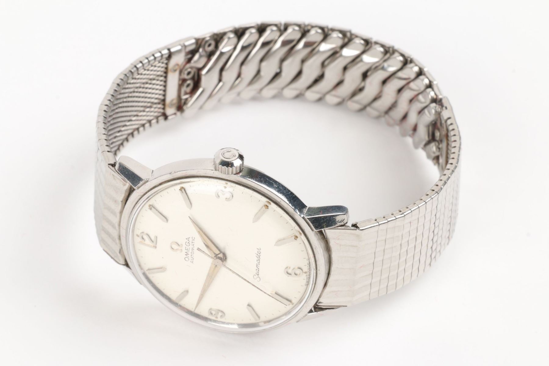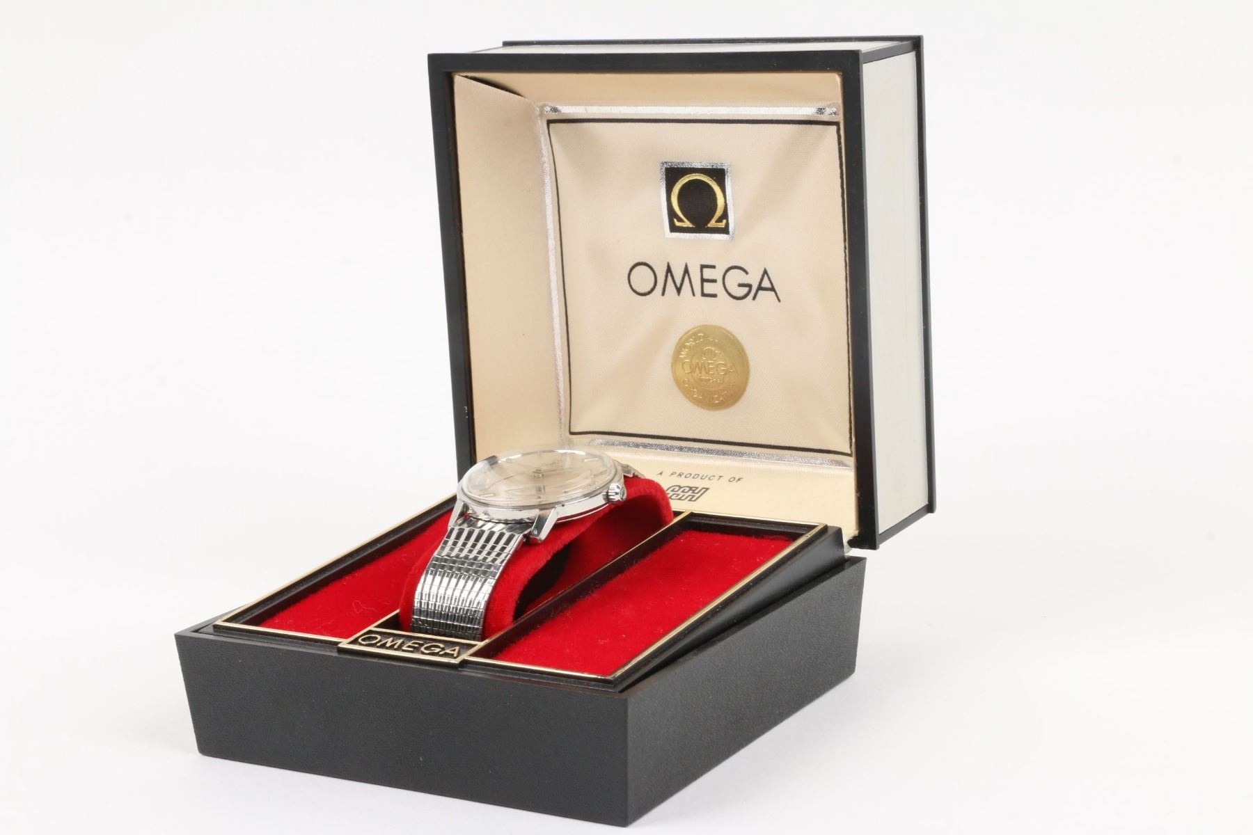 CIRCA: 1962. CASE MATERIAL: Stainless Steel. DIAL DIAMETER: 29mm. BRACELET MATERIAL: Stainless Steel. MOVEMENT: Automatic. FEATURES: Includes Box. WEIGHT: 49.0g . Est. $300-500 DISCLOSURE: Watches were running at time of photography unless otherwise stated. Service history is unknown unless paperwork is provided. We cannot guarantee accuracy of any of the watches offered. "