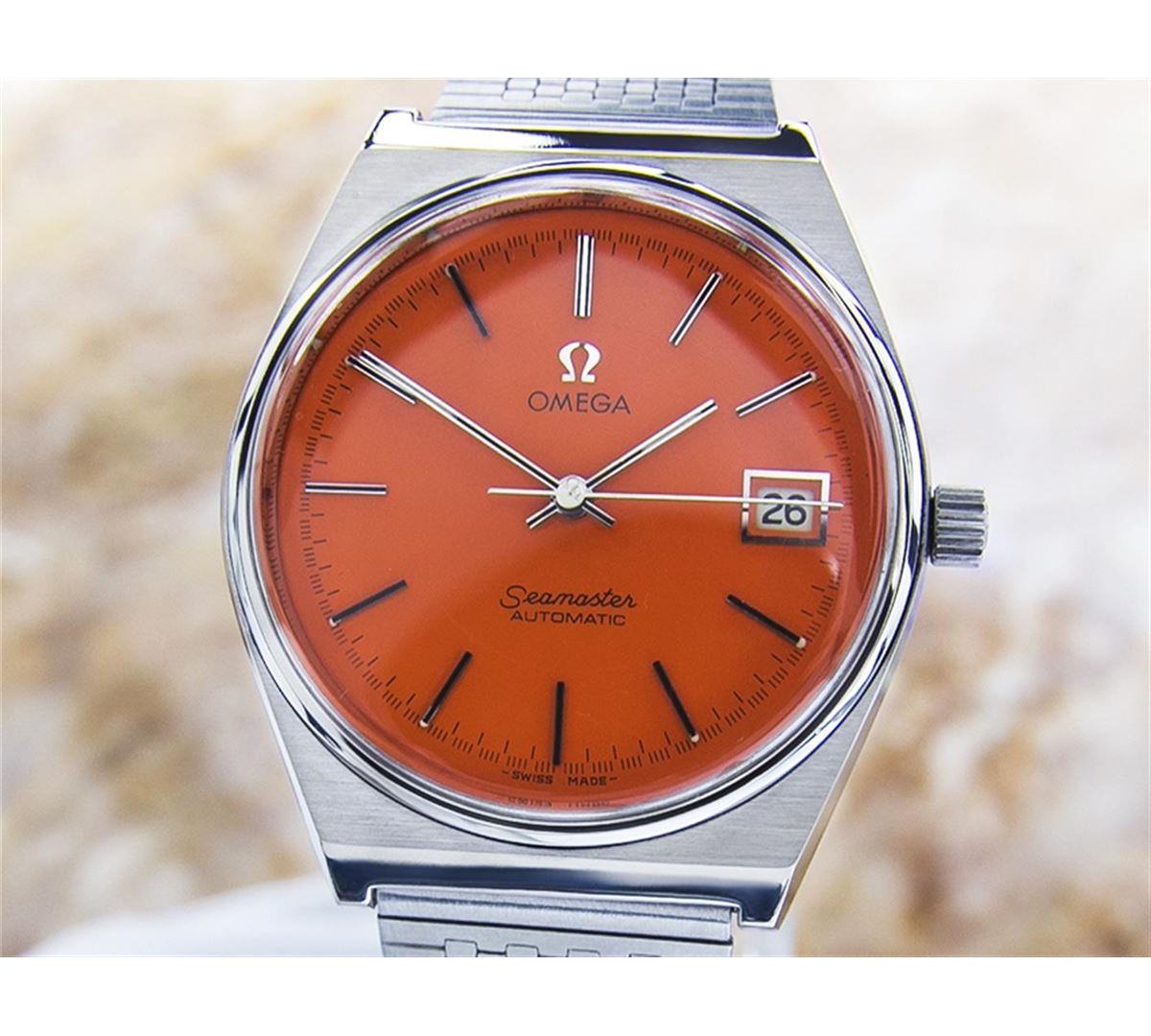 Omega Seamaster Stainless Steel Orange Dial Date Automatic Watch. Brand: OMEGA . Model: SEAMASTER. Movement: Automatic. Case Material: Stainless Steel. Crystal: ACRYLIC. Case Size: 40X35. Band: Stainless Steel OMEGA BRACELET.
