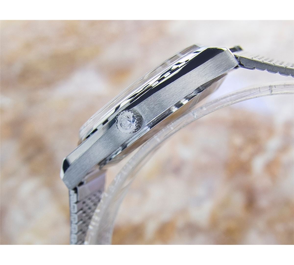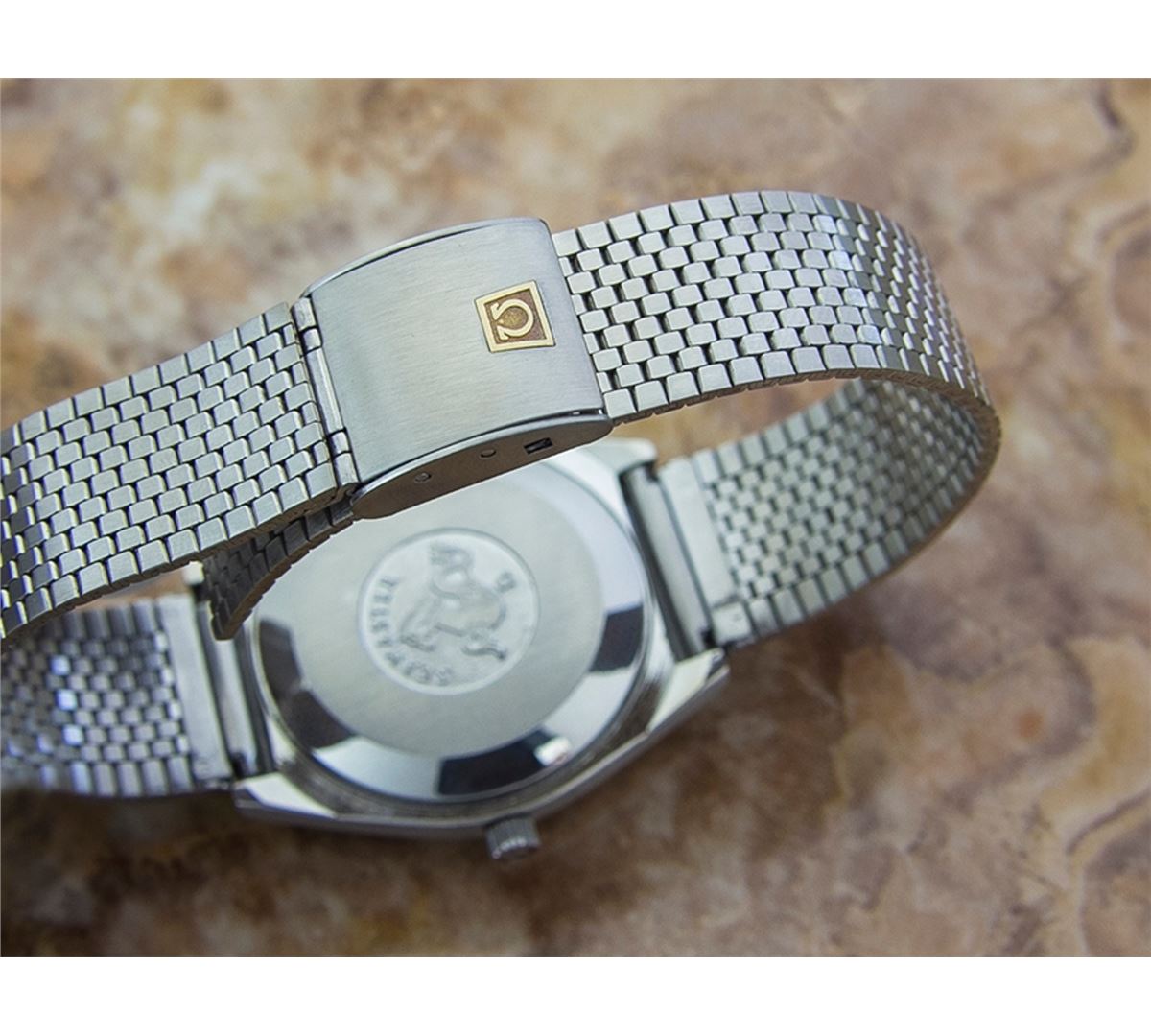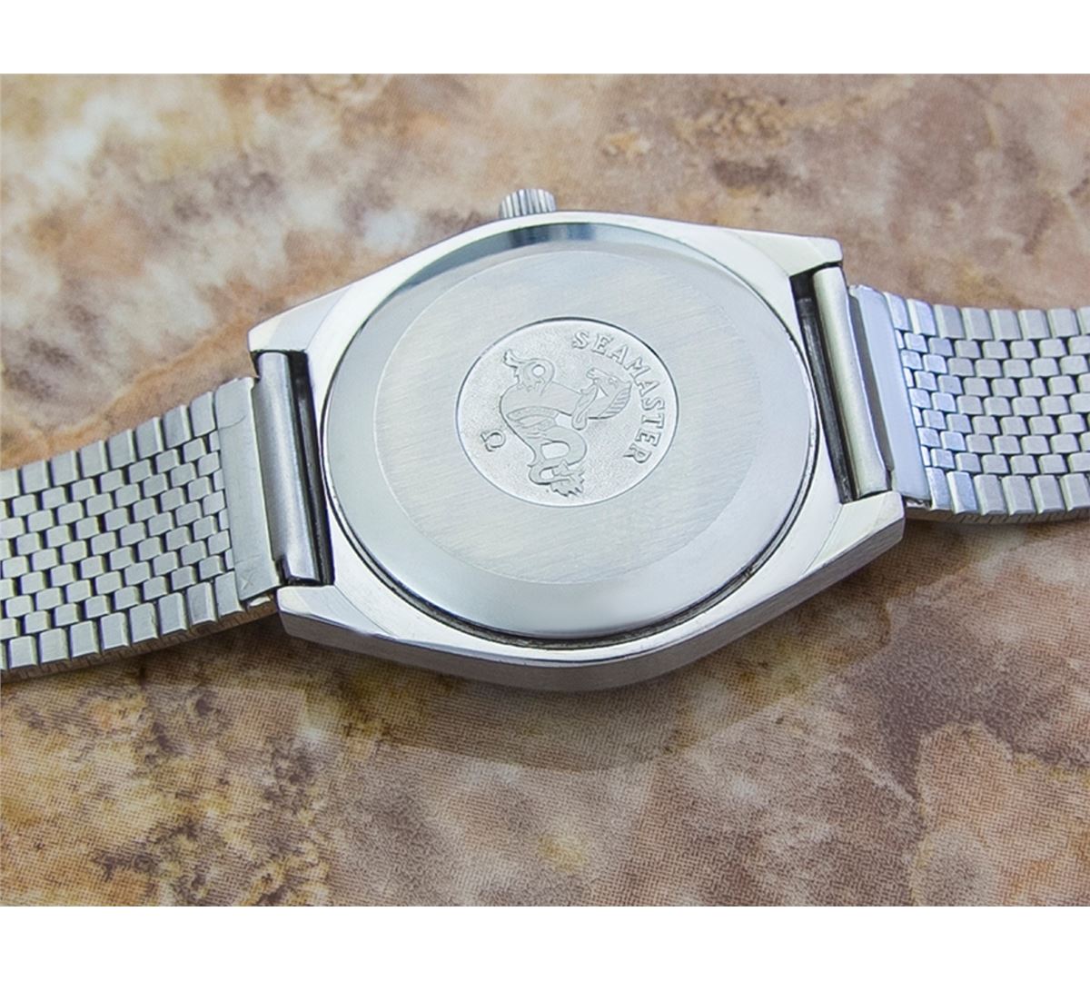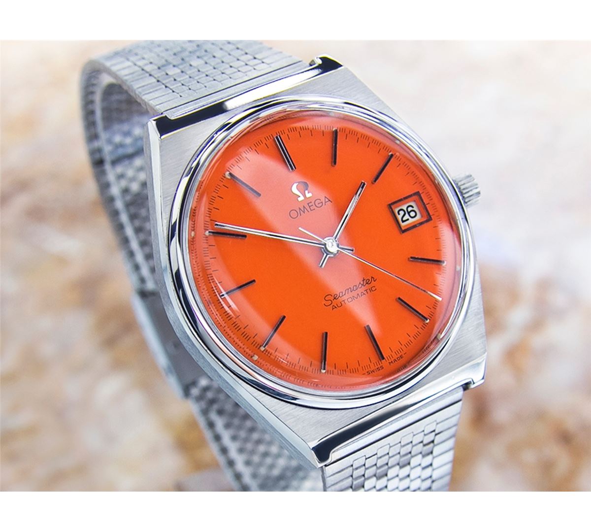 Omega Seamaster Stainless Steel Orange Dial Date Automatic Watch. Brand: OMEGA . Model: SEAMASTER. Movement: Automatic. Case Material: Stainless Steel. Crystal: ACRYLIC. Case Size: 40X35. Band: Stainless Steel OMEGA BRACELET.