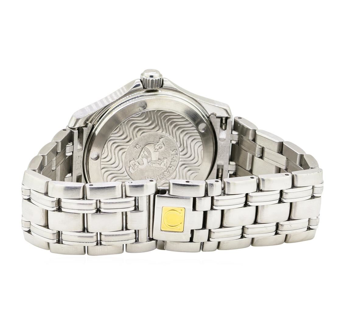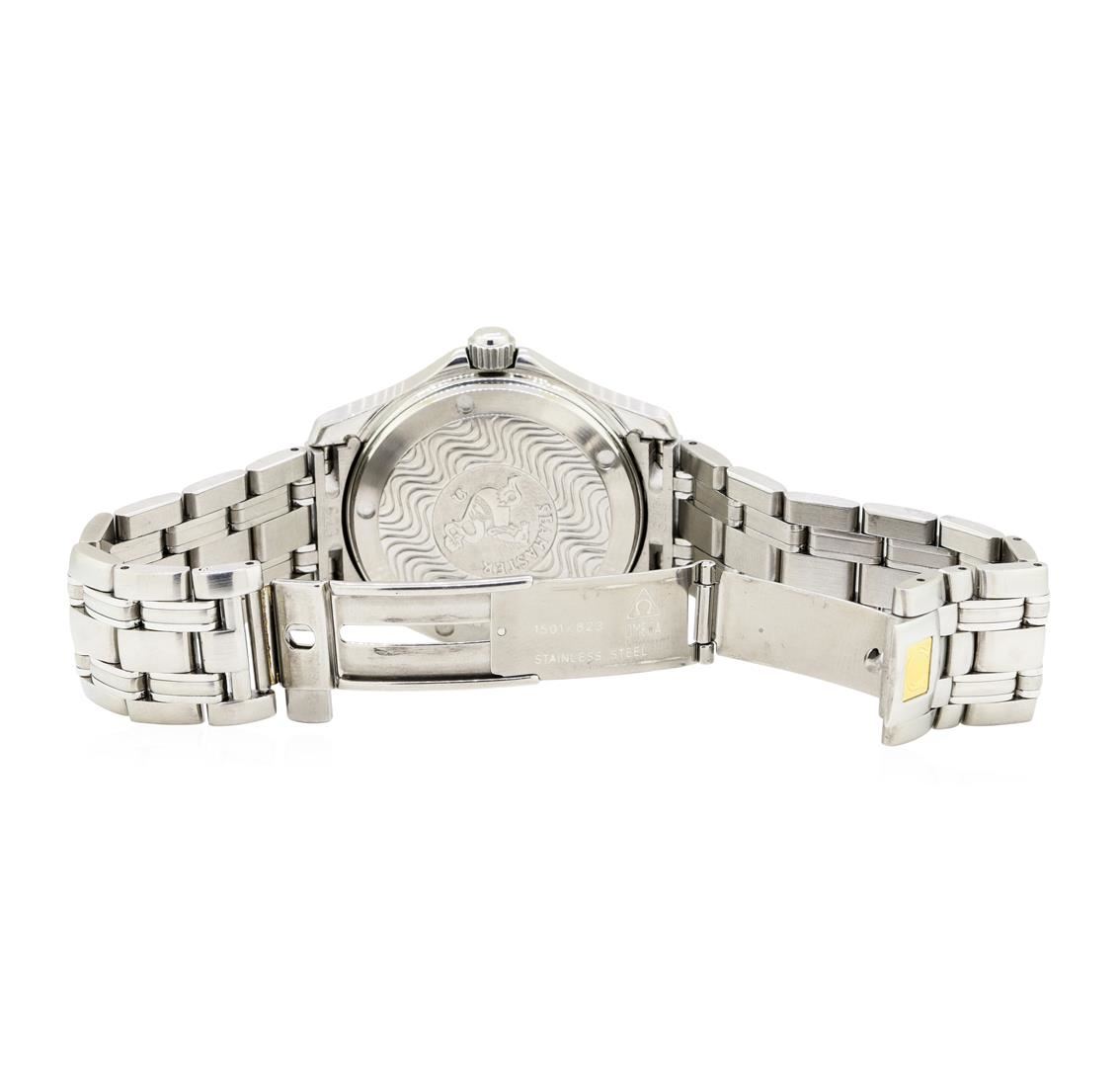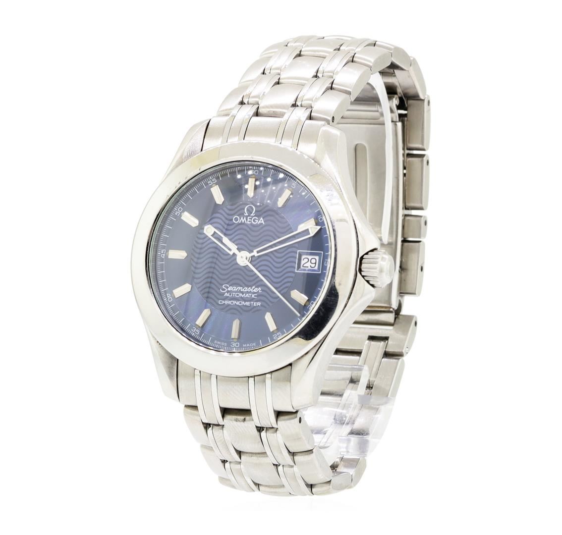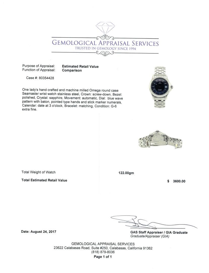 One lady's, hand crafted and machine milled Omega round case Seamaster wrist watch stainless steel, Crown: screw-down, Bezel: polished, Crystal: sapphire, Movement: automatic, Dial: blue wave pattern with baton, pointed type hands and stick marker numerals, Calendar: date at 3 o'clock, Bracelet: matching, Condition: G-6 extra fine.. Total Weight of Watch 122.00gm GAS Appraised at $3600.00. GAS Appraised at $3,600.00.