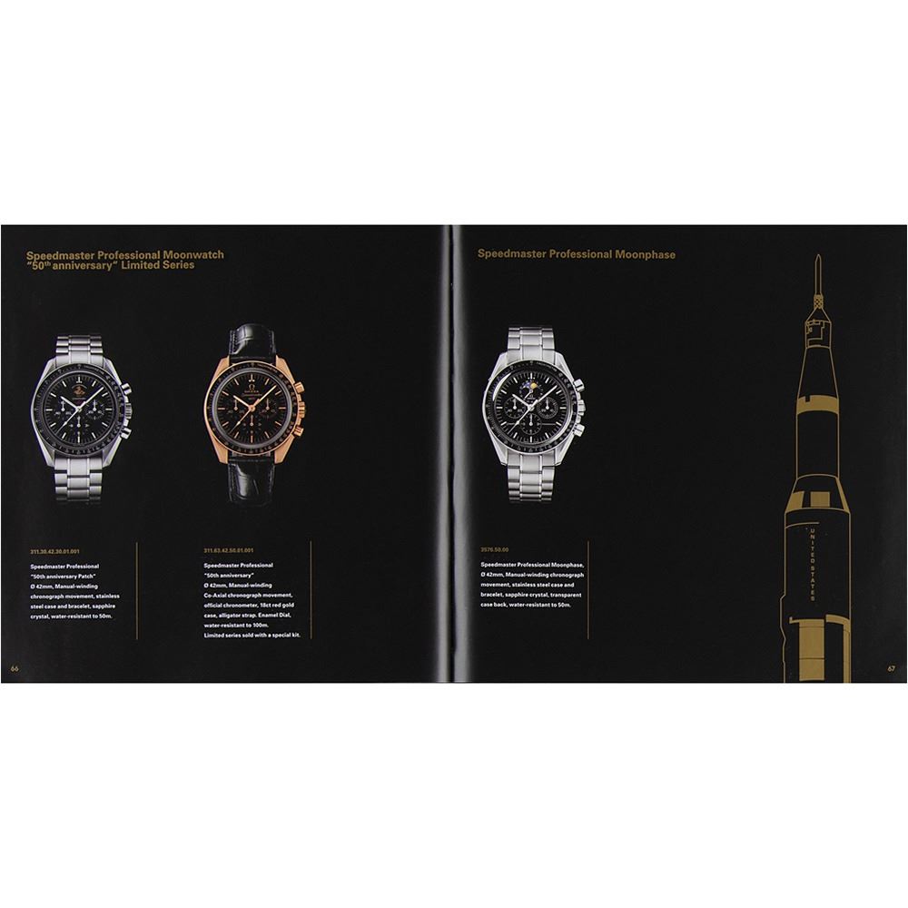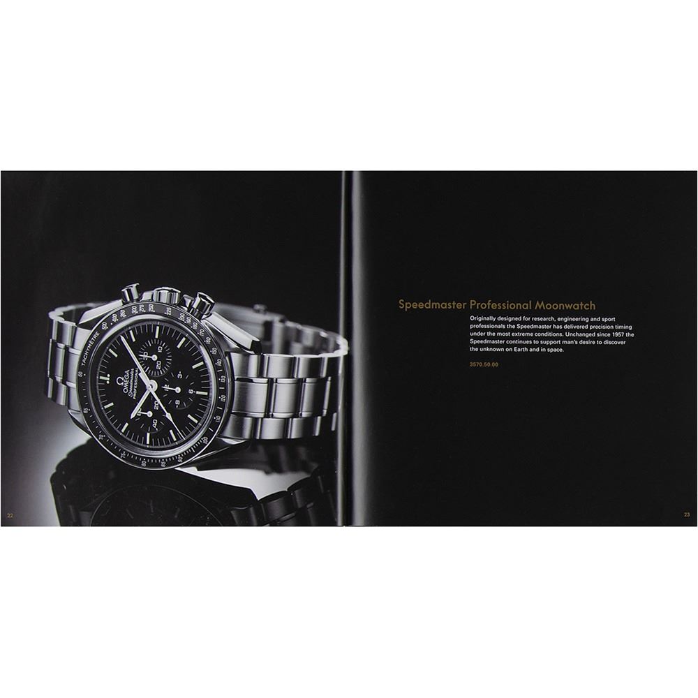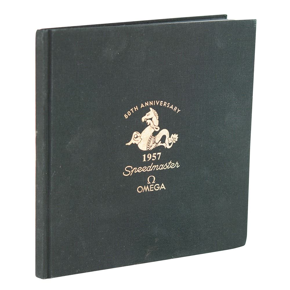 Uncommon hardcover book published in 1997 to celebrate the 50th anniversary of the Omega Speedmaster. Hardcover bound in black cloth with gilt-stamped design, 7.5 x 7.5, 79 pages. Profusely illustrated in full color, the book honors the history and legacy of the Omega Speedmaster and its tradition in space. In very good to fine condition, with some minor wear and creasing to inner pages.
