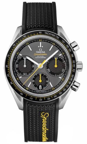 Model: 326.32.40.50.06.001 - CASE = [Material:Brushed and Polished Steel], [Case Diameter:40], [Bezel:Aluminum Filled with Tachymeter Scale], [Case Back:Solid, Engraved with Seahorse Medallion], [Water Resistant:100 Meters - 330 Feet], [Crystal:Scratch Resistant Sapphire],; DIAL = [Color:Grey Yellow Accented Chronograph with Black 'Clous de Paris' Design Sub-Dials, Date at 6],; MOVEMENT = [Type:Co Axial Chronometer with SI 14 Balance Wheel - Automatic Self Winding Omega 3330 with Approx. 50hr Power Reserve],; BAND = [Clasp:Double Push Button Deployment], [Type:Black Rubber], (In Stock - Ready to ship.)