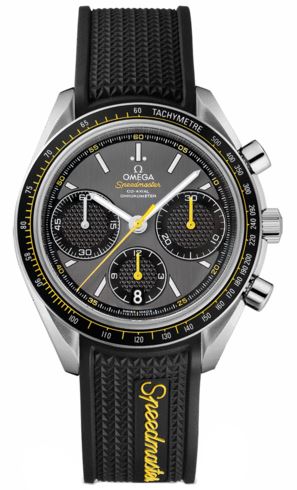 Model: 326.32.40.50.06.001 - CASE = [Material:Brushed and Polished Steel], [Case Diameter:40], [Bezel:Aluminum Filled with Tachymeter Scale], [Case Back:Solid, Engraved with Seahorse Medallion], [Water Resistant:100 Meters - 330 Feet], [Crystal:Scratch Resistant Sapphire], DIAL = [Color:Grey Yellow Accented Chronograph with Black 'Clous de Paris' Design Sub-Dials, Date at 6], MOVEMENT = [Type:Co Axial Chronometer with SI 14 Balance Wheel - Automatic Self Winding Omega 3330 with Approx. 50hr Power Reserve], BAND = [Clasp:Double Push Button Deployment], [Type:Black Rubber], (In Stock - Ready to ship.)