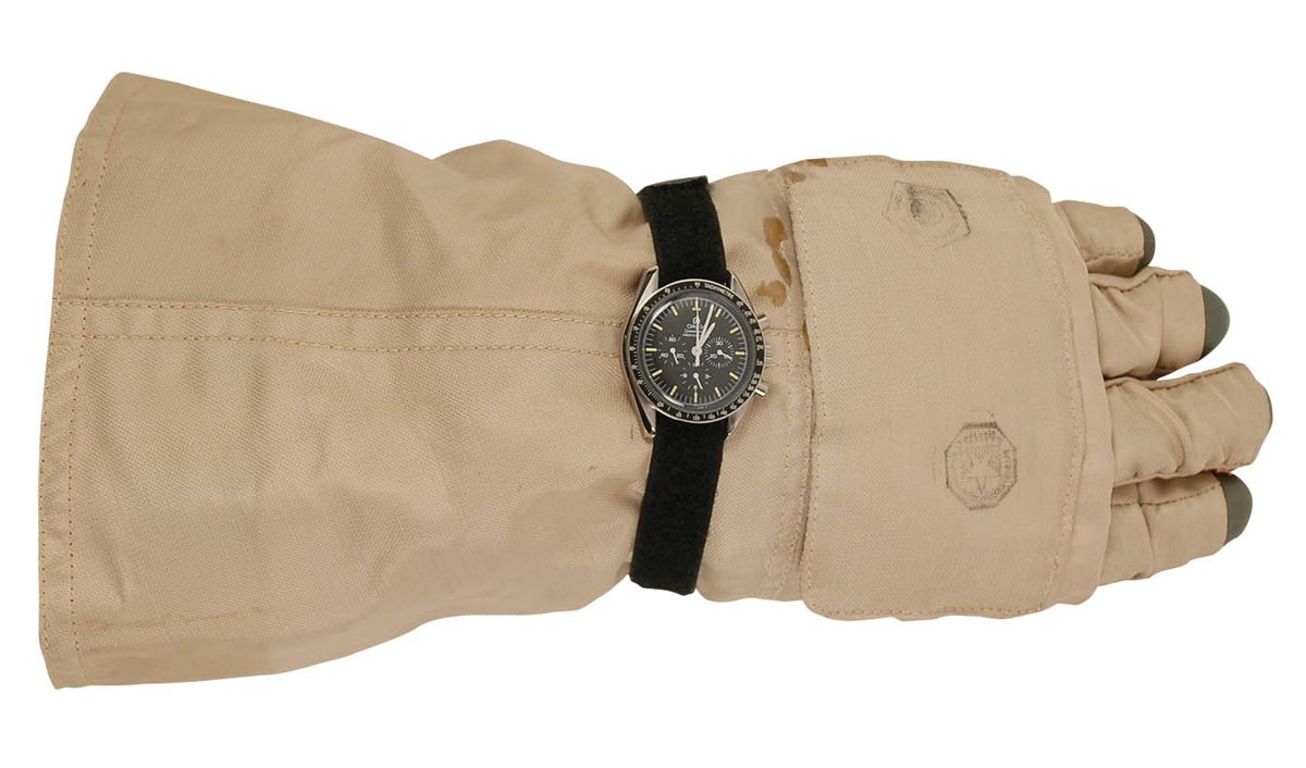 The watch is in excellent running condition, all chronograph functions working perfectly, mechanism in mint condition, dial, hands and bezels in mint condition, case nearly mint with hardly any rubbing, wear or scuffing, clearly only used as an instrument and not subjected to regular wear. The strap has some glue remnant where it was in contact with the glove. The case-back and edge was marked with red polish to indicate its sealing and full closure position, to which it has been returned. A spectacular condition example with extensive historic documentation. An excellent collector example of the “Moon Watch” model, here being one of the few on Earth that has actually been in space, complete with the glove on which it was worn, carrying clear documentation.