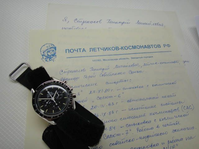Accompanied by two handwritten letters from Strekalov, in Russian. One lists his missions and commendations, and states: “’Omega’ watch—special watch for work in space—was delivered on board Mir station with ‘Soyuz TM-21’ spacecraft. It was used 5 times at EVA in period May-June of 1995.” Second letter reads, in part: “I…confirm that glove of spacesuit ‘Orlan’ was used at extravehicular activity (EVA) in May, 1995…Fastened to this glove, at EVA, was ‘Omega’ watch which was also used in subsequent four EVA.”