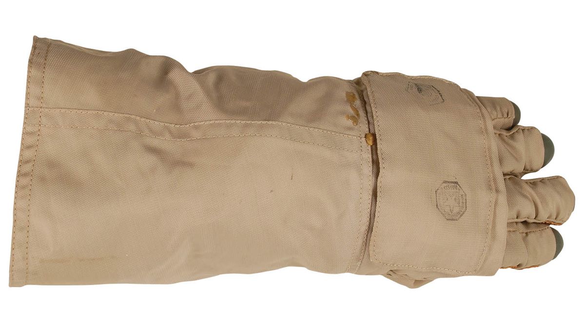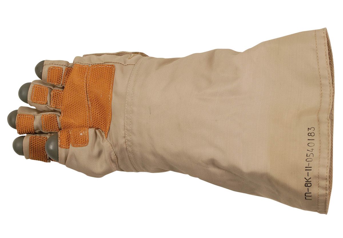 Watch is accompanied by a left-handed glove from Strekalov’s Orlan EVA space suit worn during a May 1995 spacewalk, serial number 0540183, with outer thermal insulated nylon canvas, pebbled rubber palm and finger pads, rounded rubber fingertips, and two Velcro flaps above the knuckles.