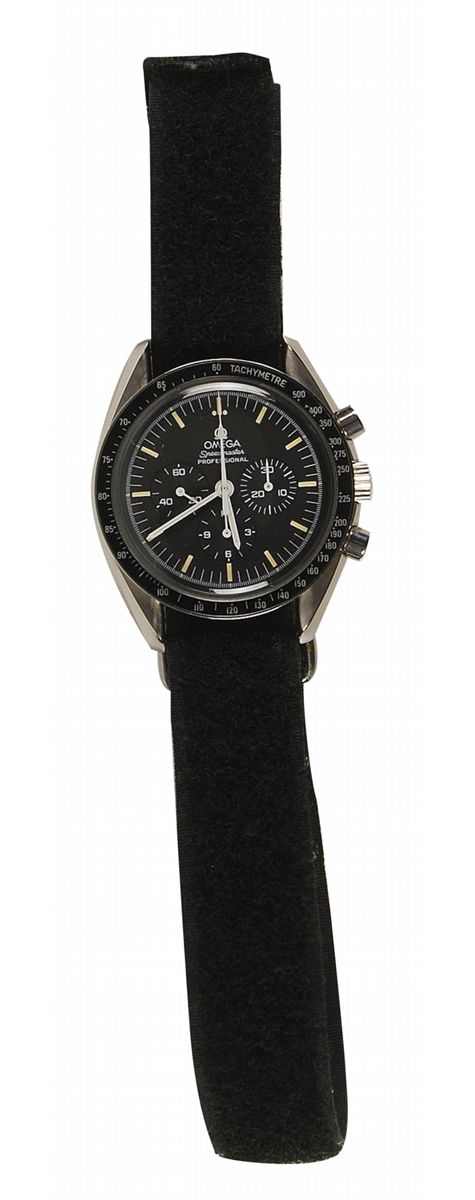 Two flown and EVA-used items worn by cosmonaut Gennadi Mikhailovich Strekalov. An important Omega Speedmaster Professional manual chronograph with NASA flight qualification logo on back, delivered to the Mir Space Station on board Soyuz TM-21, worn by Gennady Michailovich Strekalov during five of his spacewalks (EVA) between May and June of 1995, and equipped with Velcro strap for fitting around his space-suit glove. This iconic model, one of the few existing examples actually worn in space, has full chronograph functions including minute and hour registers with constant seconds, tachymeter bezel for calculations of speed in units per hour, anti-magnetic movement cover, black dial and bezel insert, luminous markers, and is engineered for full water-resistance. The mechanism is Omega caliber 861, 17 jewels, serial number 48294756 repeated on both movement and lug-back, the back with full inscription reading “Flight qualified by NASA for all manned space missions / The first watch worn on the moon” concealed largely beneath the Velcro attachment swatch.