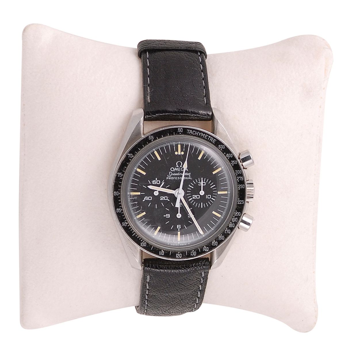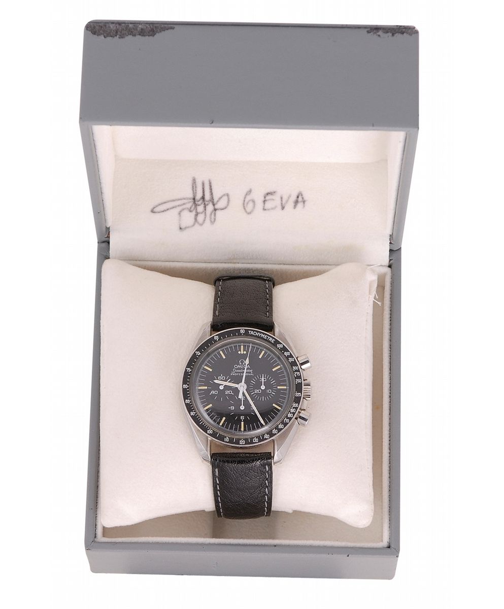 Flown stainless steel Omega Speedmaster professional wristwatch, worn by cosmonaut Anatoly Artsebarsky during his five months on the MIR space station and during all six of his EVAs into open space. Watch has three different function dials on the face in addition to the normal dial plus a tachometer band around the dial. Watch also sports a black leather band. Watch is marked on the reverse “Flight qualified by NASA for All Manned Space Missions/The First Watch Worn on the Moon.” Watch comes in its gray leather case, and is initialed on the inside by Artsebarsky, and notated “6 EVA.” In fine condition. Watch originates from Artsebarsky’s collection and was offered in the 2001 Superior Space Memorabilia Auction.