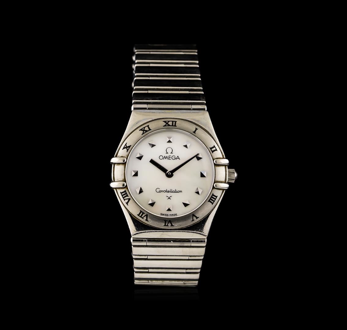 One ladies, Omega Constellation Mini wristwatch electronically tested Stainless Steel, Case: 25mm, Case Back: the Cupola of the Observatory of Geneva in high relief, Scalloped Crown: with logo, Fixed Bezel: engraved with Roman numerals, Crystal: synthetic sapphire lens. Movement: quartz, Omega signed Dial: mother of pearl, with pointed hands and indices, Bracelet: integrated factory stainless steel full bar link, Condition: G-5 Fine. Six and one half inch length. Omega push button deployment clasp. Total Weight of Watch 49.60gm. AIG Appraised at $2,250.00.