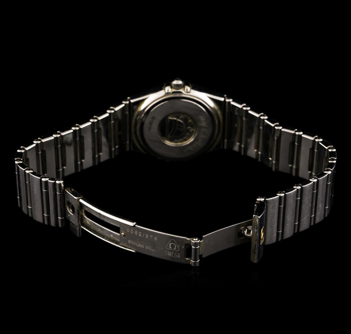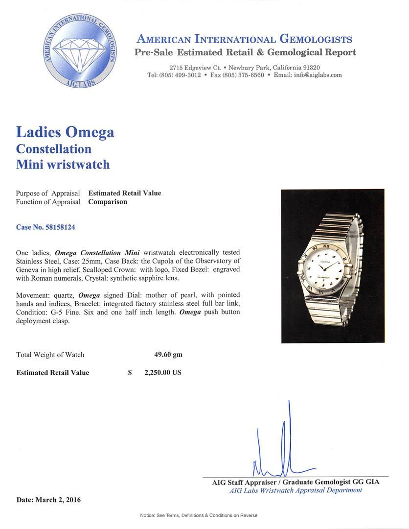 One ladies, Omega Constellation Mini wristwatch electronically tested Stainless Steel, Case: 25mm, Case Back: the Cupola of the Observatory of Geneva in high relief, Scalloped Crown: with logo, Fixed Bezel: engraved with Roman numerals, Crystal: synthetic sapphire lens. Movement: quartz, Omega signed Dial: mother of pearl, with pointed hands and indices, Bracelet: integrated factory stainless steel full bar link, Condition: G-5 Fine. Six and one half inch length. Omega push button deployment clasp. Total Weight of Watch 49.60gm. AIG Appraised at $2,250.00.