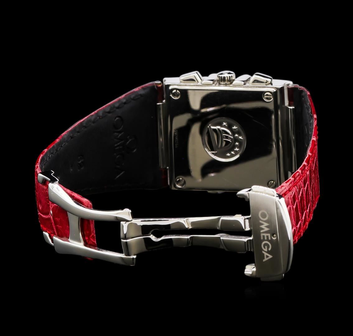One, Omega Constellation Quadra wristwatch electronically tested, stainless steel Rectangular Case: 34 x 28mm, Water Resistant: 30 meters / 100 feet, Case Back: displays the Omega observatory emblem showing a night sky lit by eight stars, Crown: scalloped, with logo, Bezel: diamond set, Crystal: domed synthetic sapphire. Omega signed Dial: Black, with baton hands, a bordering minute track with bolded five minute intervals, three numerals and four diamond markers, Chronograph Functions: three square shape sub dials for: hours, minutes, and seconds, Movement: quartz, Bracelet: seven and one half inch length saddle stitched Omega leather strap. Omega concealed deployment clasp. Condition: G-6 Extra Fine. Containing: Thirty Eight prong set round brilliant cut diamonds, measuring an average of 1.80mm in diameter, approximate total weight of 38 Stones = 0.85ct. Set & graded in the bezel. Clarity: VVS-1 to VVS-2. Color: E - F. Total Weight of Diamonds 0.85ct. Total Weight of Watch 61.88gm. AIG Appraised at $5,220.00.