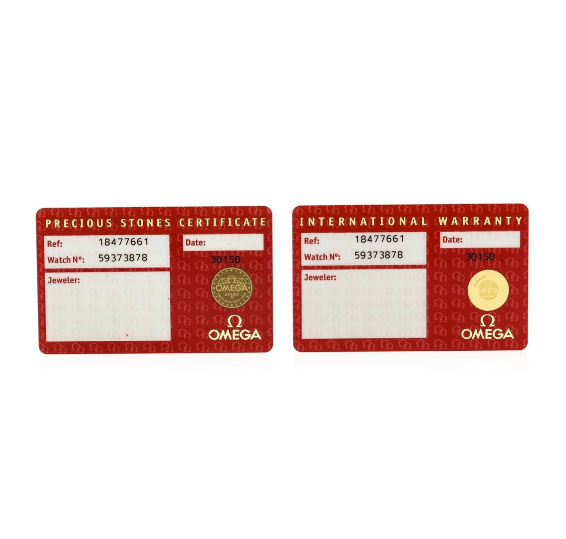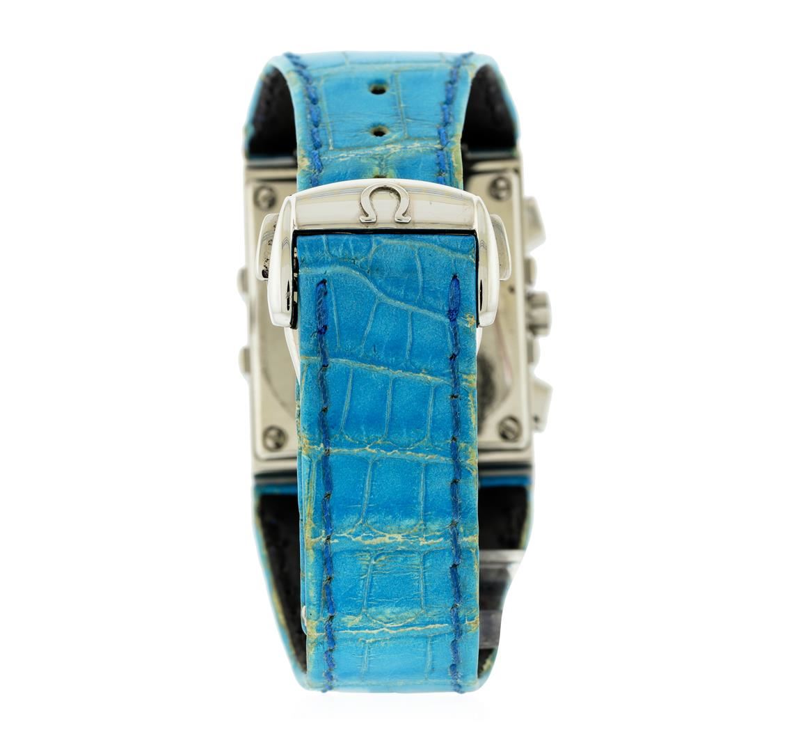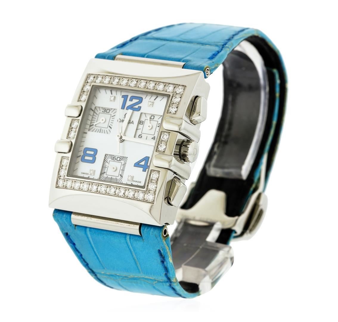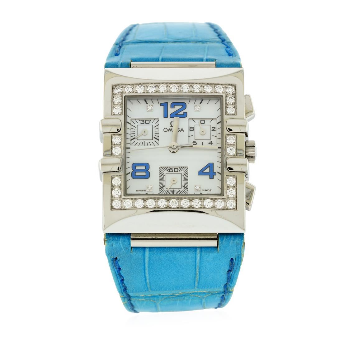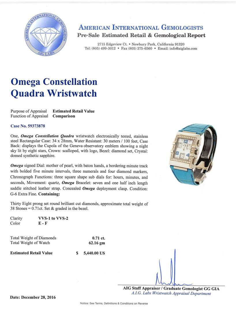 One, Omega Constellation Quadra wristwatch electronically tested, stainless steel Rectangular Case: 34 x 28mm, Water Resistant: 30 meters / 100 feet, Case Back: displays the Cupola of the Geneva observatory emblem showing a night sky lit by eight stars, Crown: scalloped, with logo, Bezel: diamond set, Crystal: domed synthetic sapphire. Omega signed Dial: mother of pearl, with baton hands, a bordering minute track with bolded five minute intervals, three numerals and four diamond markers, Chronograph Functions: three square shape sub dials for: hours, minutes, and seconds, Movement: quartz, Omega Bracelet: seven and one half inch length saddle stitched leather strap. Concealed Omega deployment clasp. Condition: G-6 Extra Fine. Containing: Thirty Eight prong set round brilliant cut diamonds, approximate total weight of 38 Stones = 0.71ct. Set & graded in the bezel. Clarity: VVS-1 to VVS-2 Color E - F. Total Weight of Diamonds 0.71ct. Total Weight of Watch 62.16gm. AIG Appraised at $5,440.00.