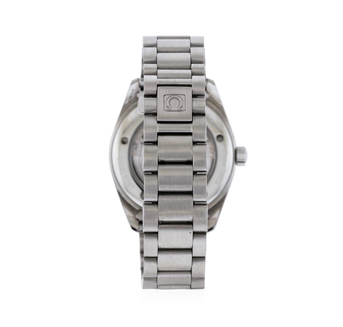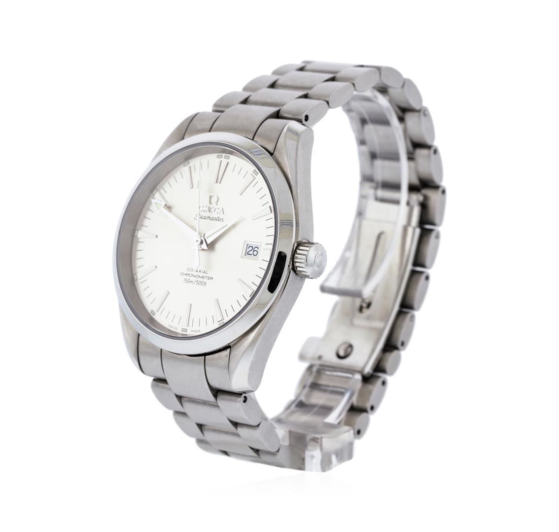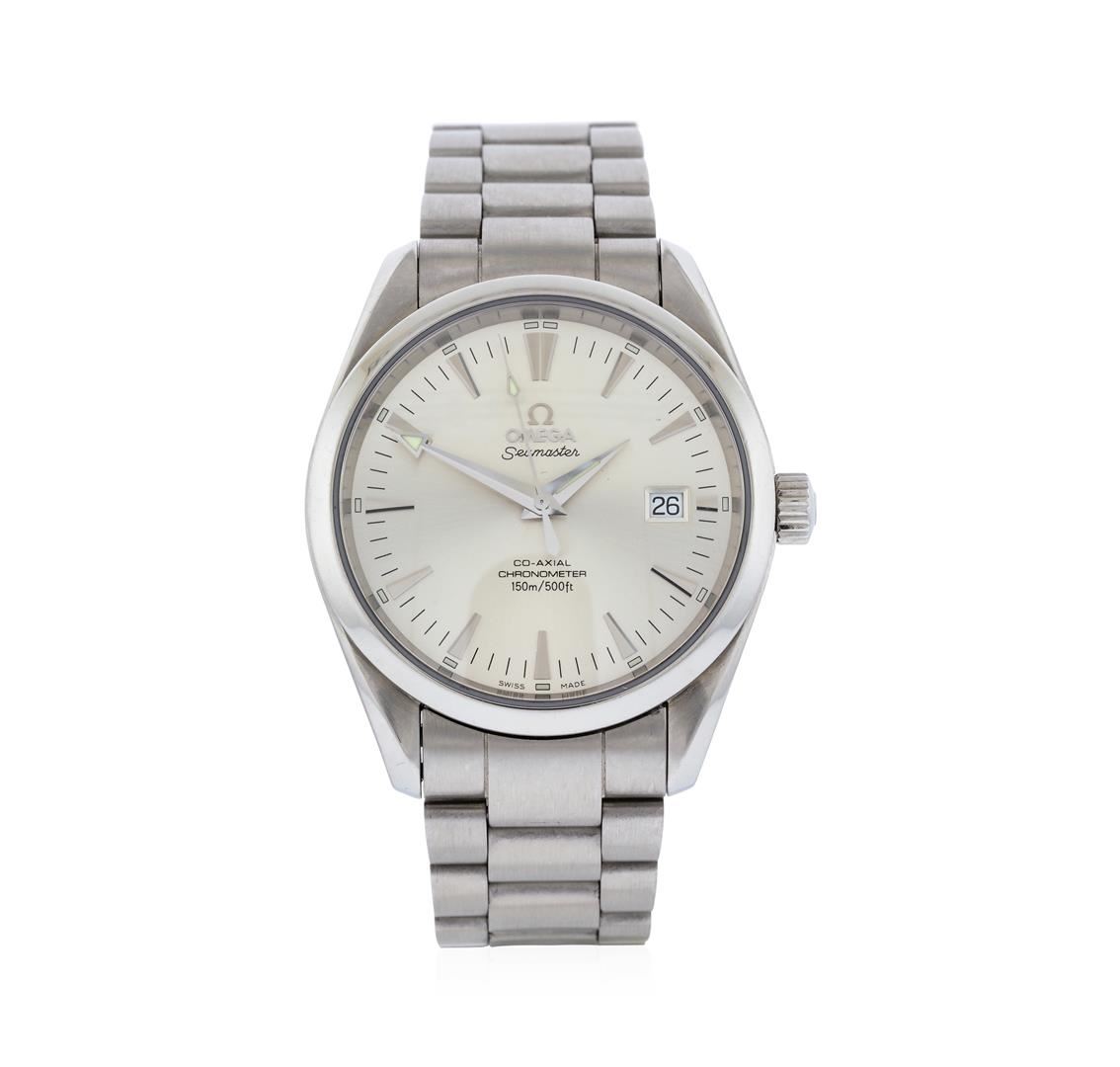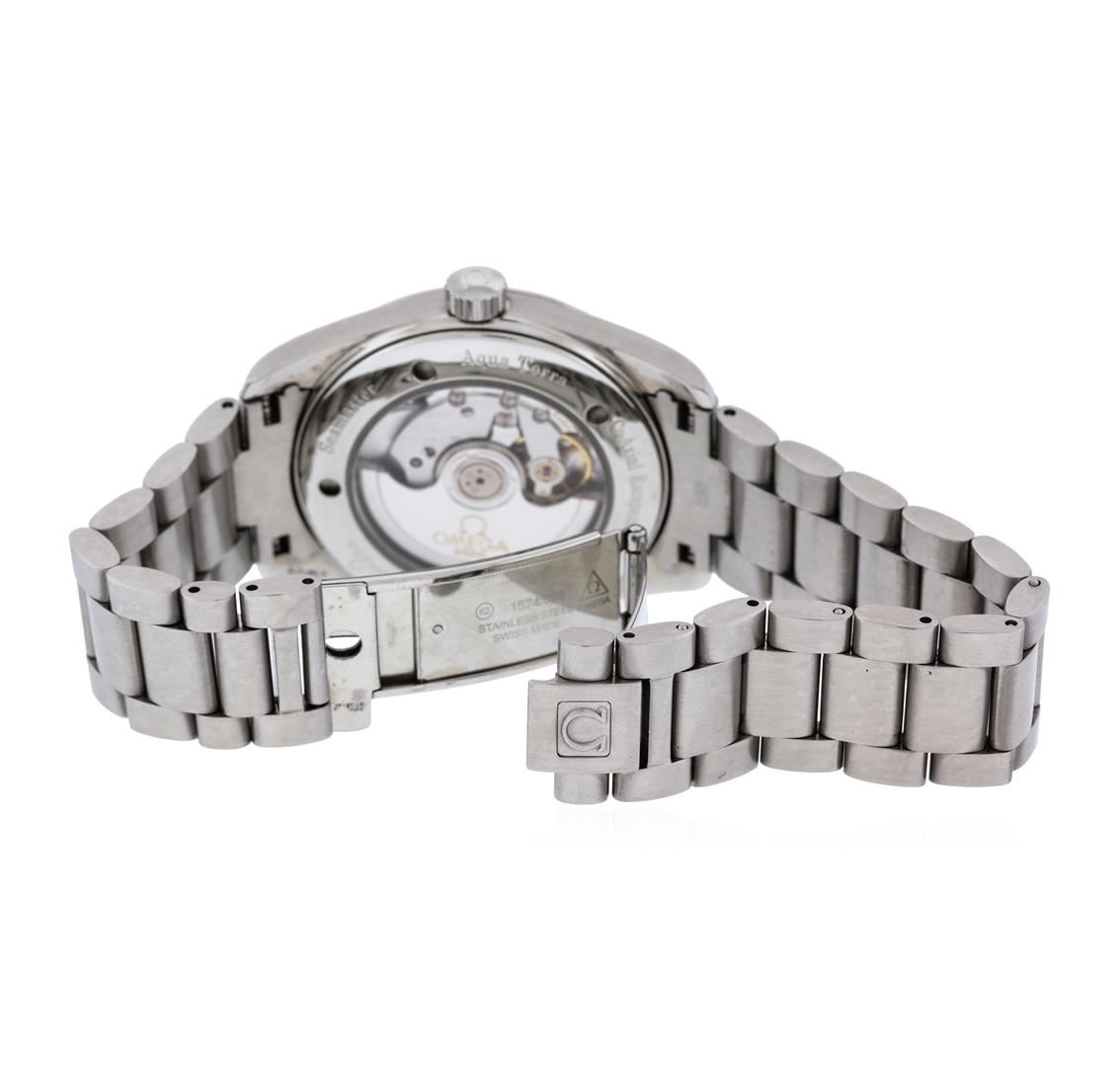One Omega Seamaster Aqua Terra watch men's featuring: Case: Stainless steel. Case back: Transparent. Bezel: Polished stainless steel; fixed. Crown: Screw down. Dial: Silver; date window located at the 3 o'clock position; index hour markers. Bracelet: Stainless steel.