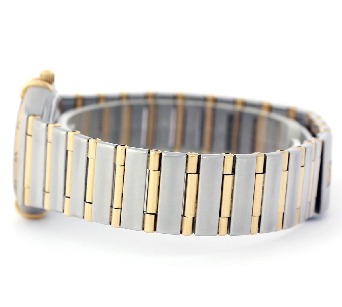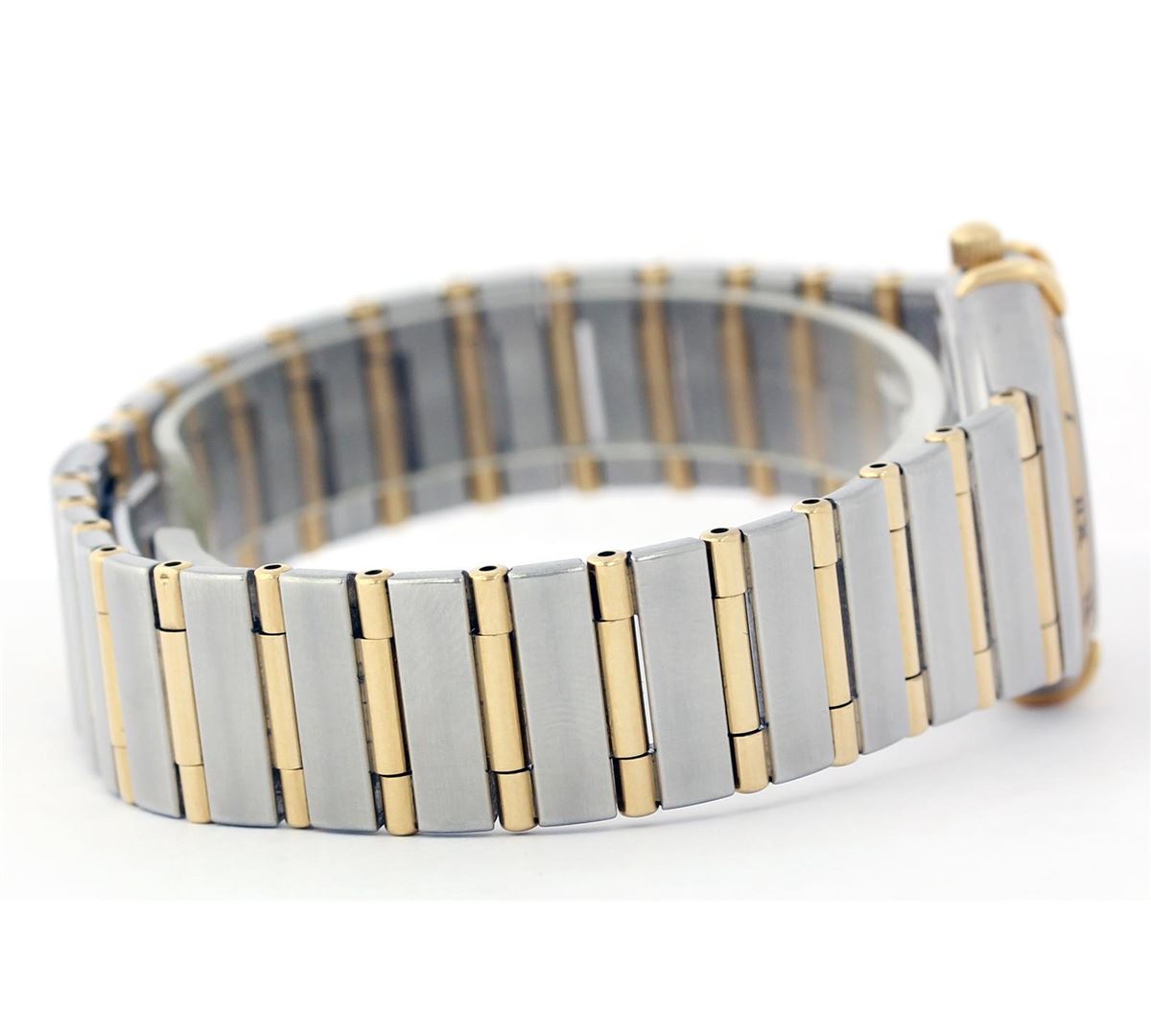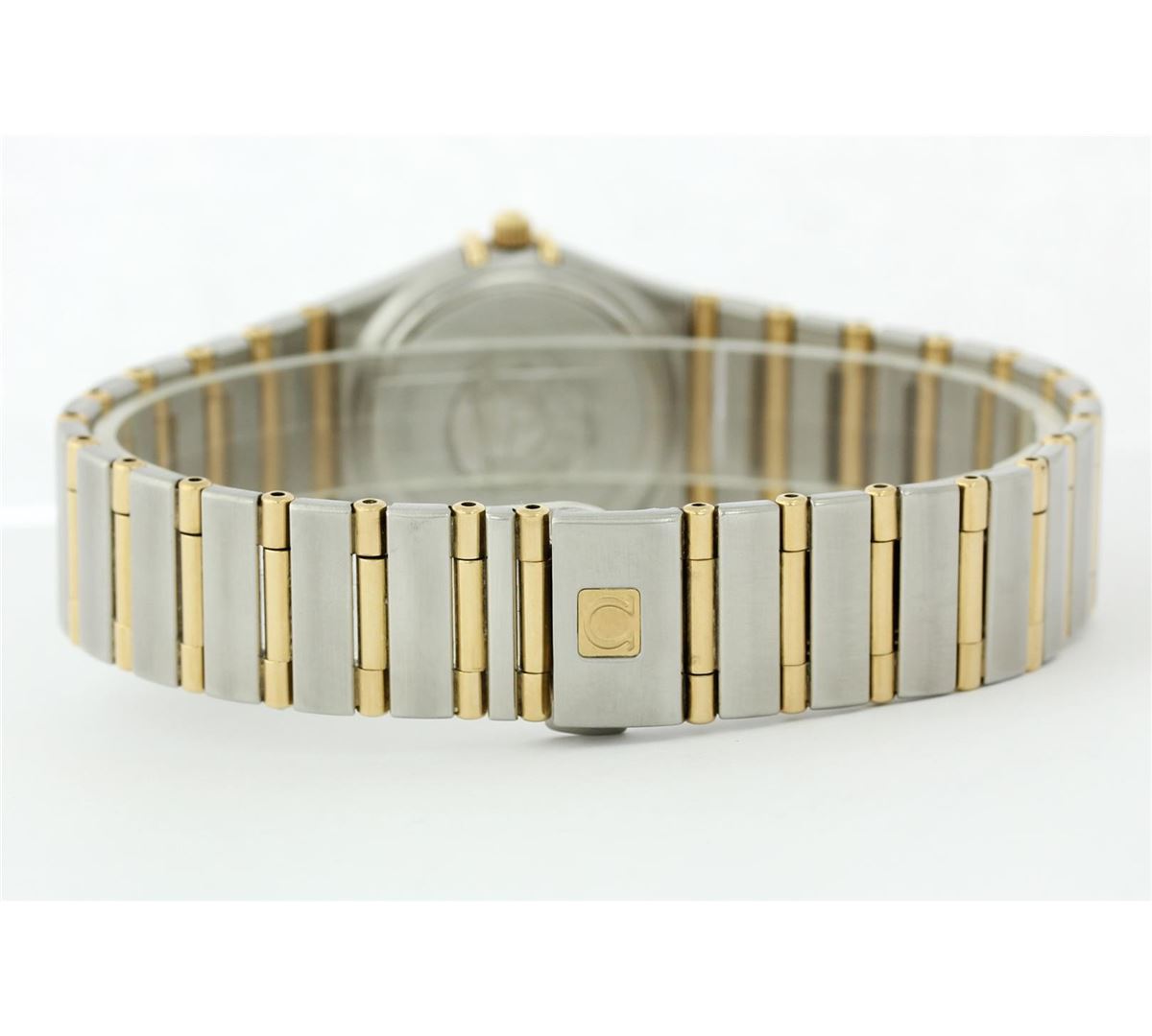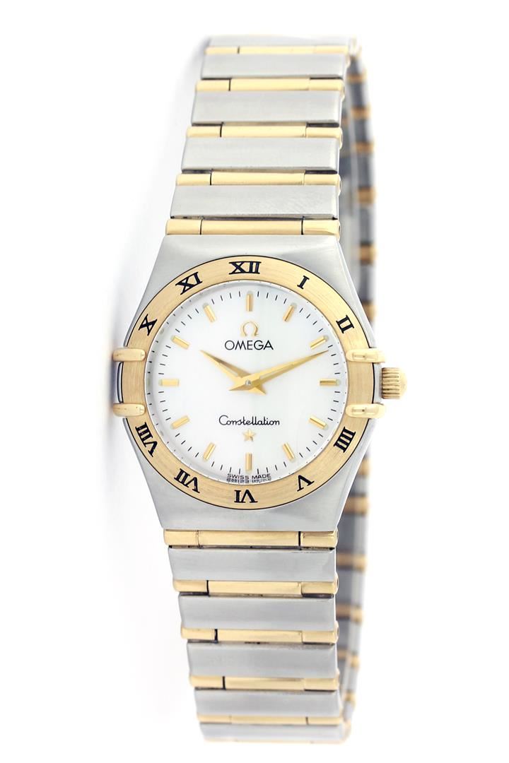 One Ladies Omega Two Tone Constellation, Serviced & Electronically Tested, Case:24mm, Yellow Gold Crown, Bezel: Yellow Gold Bezel, Crystal: Sapphire Lens. Movement: Quartz Caliber 1376 Movement Dial: Mother Of Pearl Dial With Index Hour Markers. Condition: G-6 Extra Fine. Bracelet: Yellow Gold & Stainless Steel 6.5 Inch Length, Adjustable. Standard Clasp, With Omega Logo on Clasp.