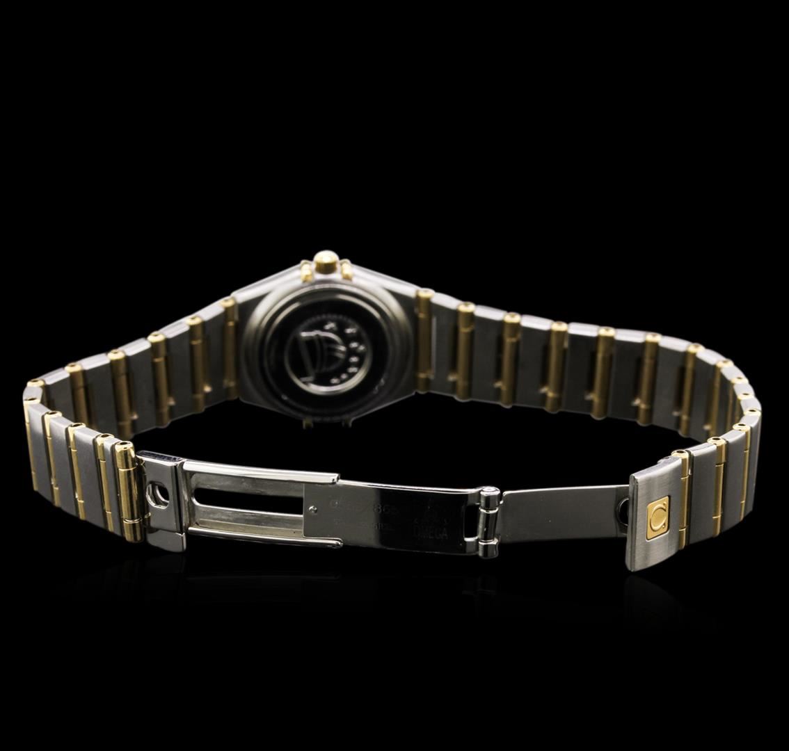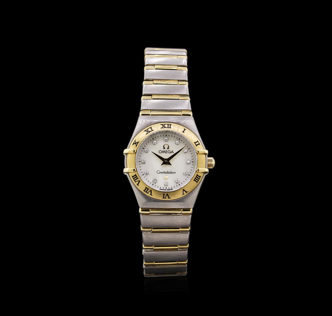 Movement: Quartz. Case: Stainless steel and 18KT yellow gold. Bezel: 18KT yellow gold. Crystal: Scratch resistant sapphire crystal. Dial: Mother of pearl with diamond hour markers. Band: Stainless steel and 18KT yellow gold. Watch will fit up to a 7" wrist. Classic watch in excellent condition. Recently serviced.