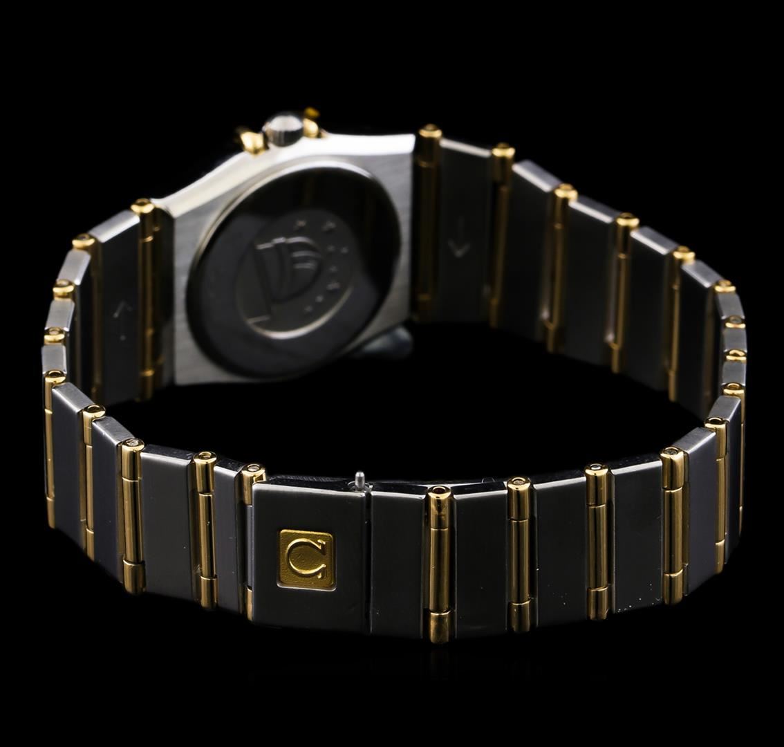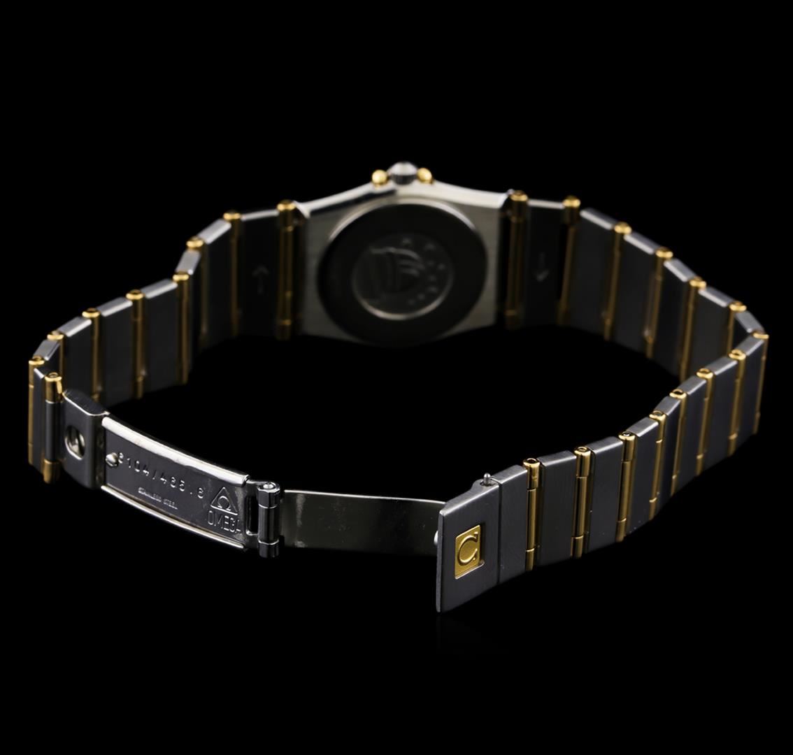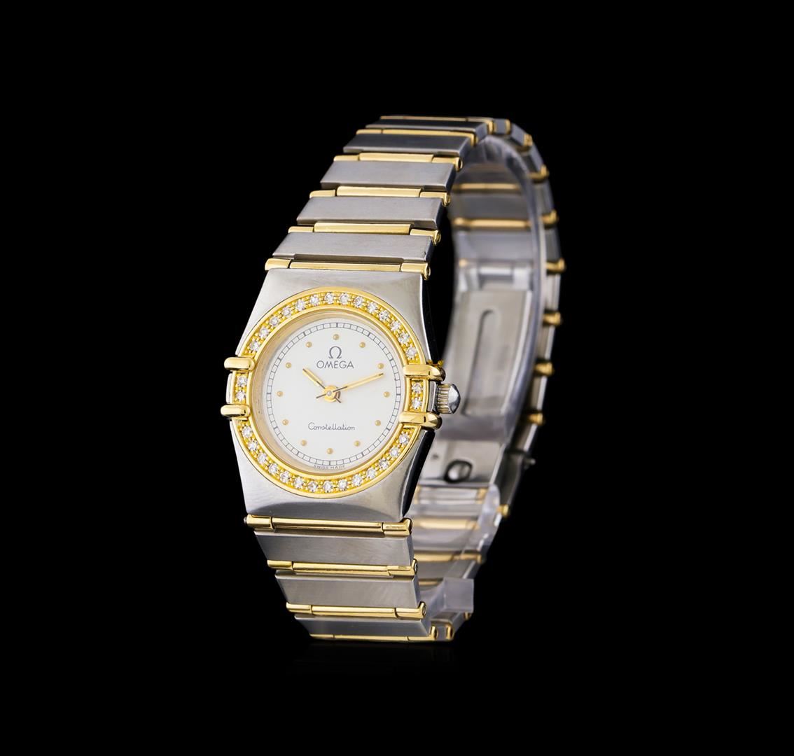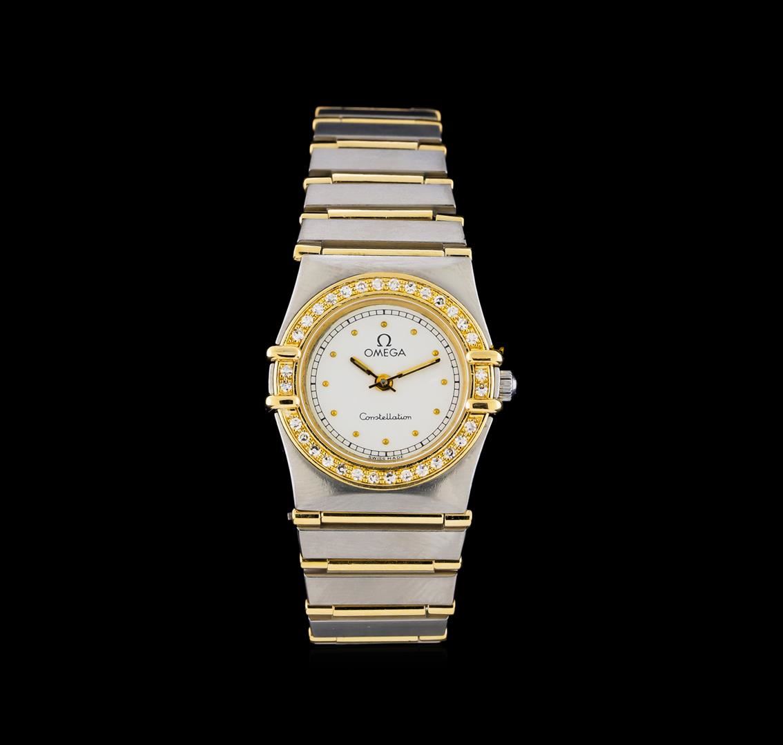 One Omega Constellation ladies watch featuring: Movement: Quartz. Case: Stainless steel and yellow gold. Bezel: yellow gold diamond set. Crystal: Sapphire. Dial: White color; yellow gold hour markers. Bracelet: Stainless steel and yellow gold.