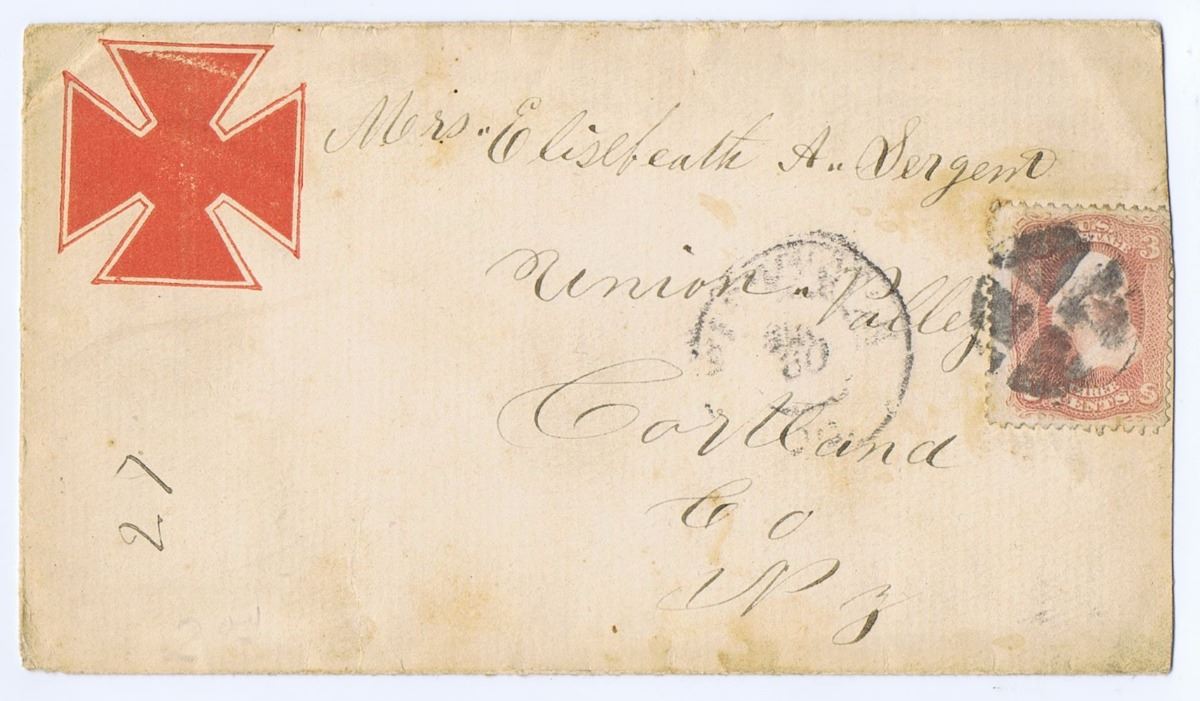 Red Maltese cross of (5th Corps, 1st Division, Army of Potomac) on unusually high quality, pale ivory laid cover. Scott #65, judged rose pink, with four-slice pie fancy, and very light Washington, D.C. c.d.s., June 30. To "Mrs. Elisebeath A. Sergent, Union Valley, Cortland Co., N.Y." The V Corps boasted a series of top commanders, including Banks, Porter, Hooker, Butterfield, Meade, Sykes at Gettysburg, et al. Edge wear, some soiling, several perfs trimmed where cover opened at right, else satisfactory. A seldom-seen paper stock for a patriotic, suggesting this was privately printed. Old pencil on verso, "Sold in Walcott 1934 Sale for $4.00." A Pvt. John Sergent of Taylor, N.Y. - neighboring Union Valley - served in the 10th N.Y. Cavalry, wounded at Richmond.