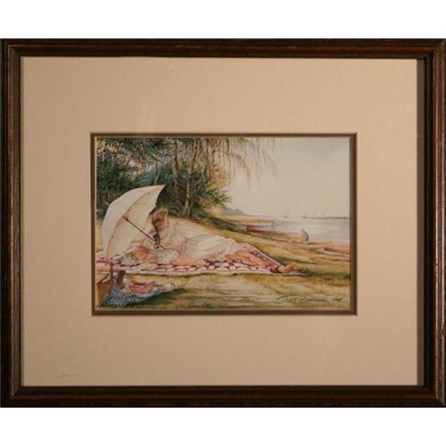 </font></strong>Prolific Canadian artist Trisha Romance has made a name for herself in the art world through her beautiful illustrations of Victorian genre scenes. ?On the Beach? is one such piece that illustrates a wonderfully warm and tender moment as a mother reclines peacefully beneath a parasol watching a young child play near the water while a baby sleeps beside her. Romance drew much of her inspiration from her own experiences as a mother and the unyielding bond that exists between a mother and her children. Everything in this charming composition was rendered with fine detail, from the picnic basket, to the quilt they are laying on, and even to the small sailboats gliding along the glistening water on the horizon. The lush trees and vegetation in the top left corner frame the figures perfectly and highlight their soft delicacy. The print has been double matted in deep brown on the bottom to create a warm border for the piece, and a cream top mat to extend the area of the picture plane. The piece is mounted in a dark walnut frame that echoes the brown mat creating further dimension and bringing the total measurements to 13 ¾? x 11 ½.? The artist?s signature can be seen in the bottom right corner as well as the year 1985. Trisha Romance?s paintings can be seen on everything from posters and Christmas ornaments, to books and limited edition prints that sell for hundreds of dollars. This print would be the perfect, affordable piece to start your collection of Romance?s beautiful ...