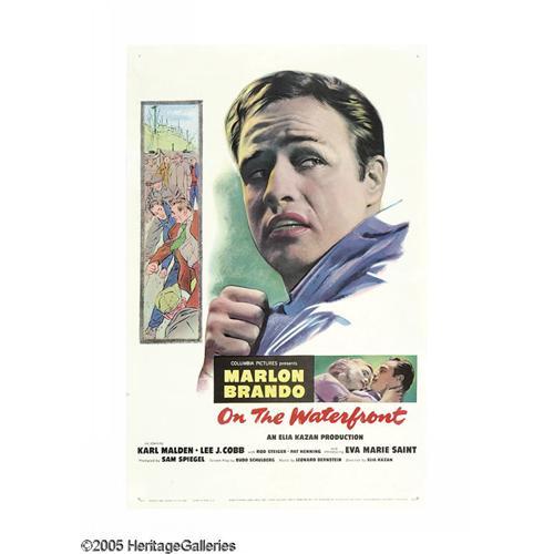 <B>On the Waterfront (Columbia, 1954).</B></I> One Sheet (27" X 41"). Marlon Brando is Terry Malloy, an ex-prize fighter struggling against union corruption along the New York waterfront, in Elia Kazan's film classic. Malloy's battle takes him all the way to the witness stand, where he finds himself testifying against union leaders. The film was Kazan's response to his decision to turn in the names of his Hollywood contemporaries during Senator Joe McCarthy's anti-Communism hearings. The film won eight Academy Awards including Best Picture, Best Director and Best Actor. Prior to this poster being linen backed, there was a corner off in the upper left border. Aside from that the most minimal fold and centerpoint touchup was done. Very Fine on Linen.