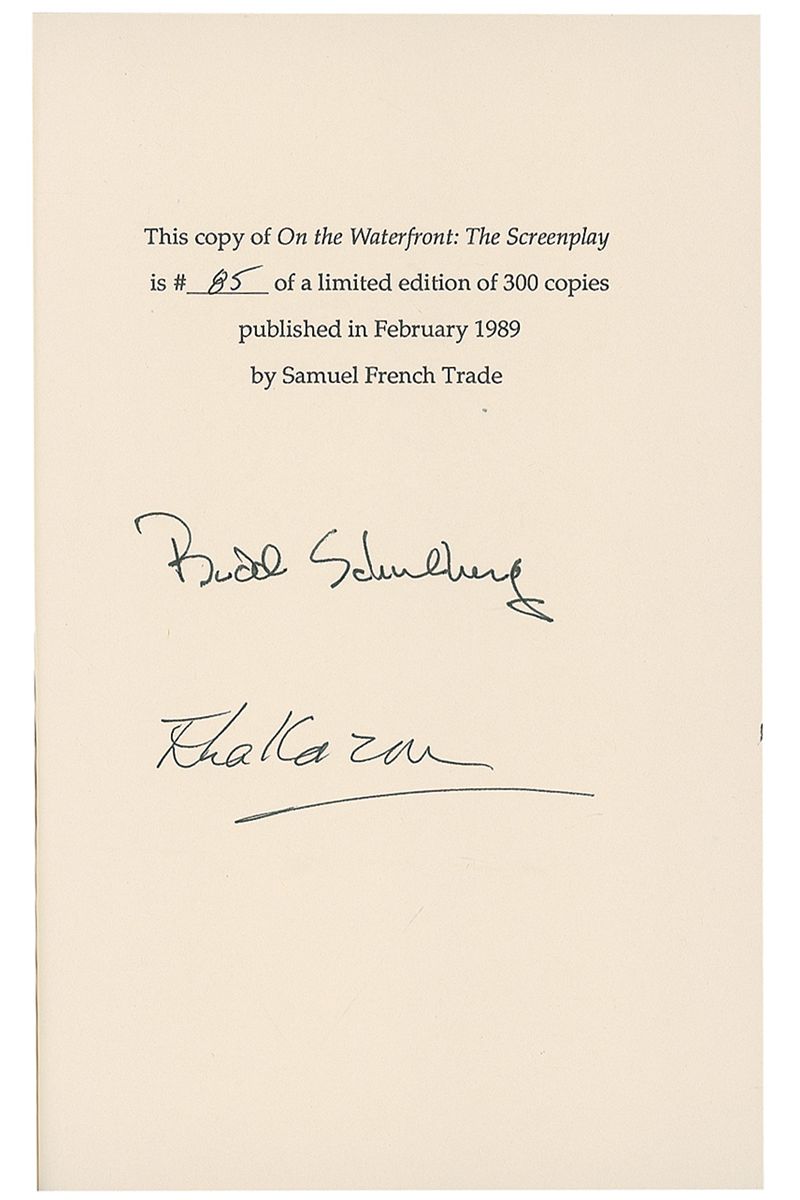 Signed book: On the Waterfront: The Final Shooting Script. Limited edition of 300 copies (this copy No. 85). Hollywood: Samuel French, 1980. Hardcover, 5.75 x 9, 153 pages. Signed in black ink on the colophon page by Elia Kazan and Budd Schulberg. In very fine condition.