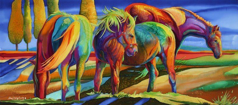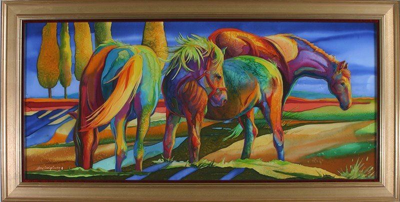 Artist: Nancy Dunlop Cawdrey. Title: On the Wild Side. Artwork size: 21" x 48". Frame: 28" x 55". Medium: Dye on Silk. Artist's description: