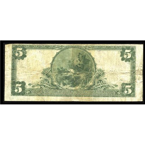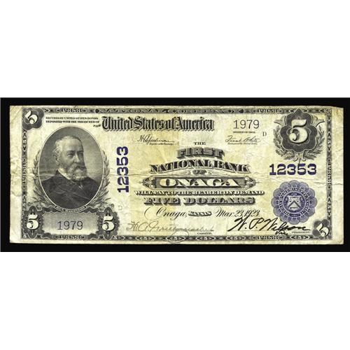 <B>Onaga, KS</B></I> - $5 1902 Plain Back Fr. 609 <B>The First NB</B></I> Ch. # 12353<BR>This <B>Very Fine</B></I> example is signed by Vice President W.P. Wilson and makes only the sixth large size note to be documented from this institution, which was chartered in 1923 and issued only the $5 denomination in Plain Backs and the 1929 series. Given the fact that a meager $550 remained in the hands of the public as of 1935, we doubt that there remains an appreciable number of notes from here yet to be discovered. Plan on spirited competition before the hammer falls tonight to signal a change in ownership for this desirable Kansas National.