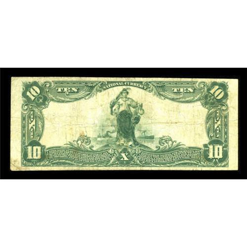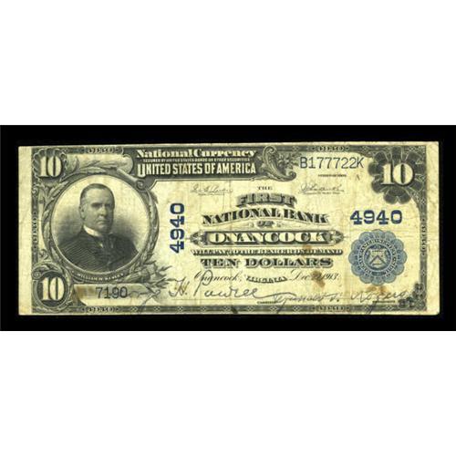 <B>Onancock, VA</B></I> - $10 1902 Plain Back Fr. 631 <B>The First NB</B></I> Ch. # 4940<BR> A very rare note from an eastern shore bank with only a literal handful of large examples listed in the census, making it no surprise that the last large note to be offered from here was sold in 1995. <B>About Fine,</B></I> with clear signatures.<BR><I>From The Kansas City Collection.</B></I><BR><BR><b>Shipping:</b> Coins & Currency (<a target="_blank" href="http://www.heritageauctions.com/common/shipping.php">view shipping information</a>)