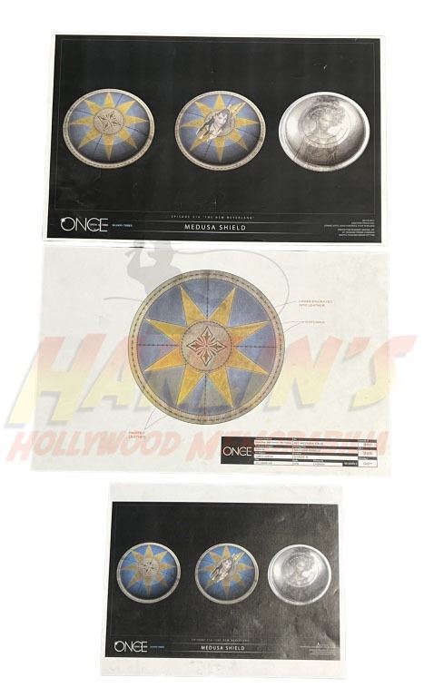 Original set of three concept artworks pieces (production used prints) for the "Medusa Shield", used in the production of the fantasy adventure drama television series 'Once Upon a Time' (2011-2018), that aired for seven seasons on ABC from October 23, 2011 to May 18, 2018.