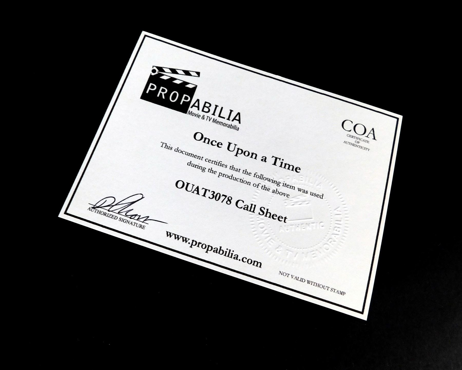 This Call Sheet was acquired by the production for use in 'Once Upon a Time' (ABC, 2011-2018).