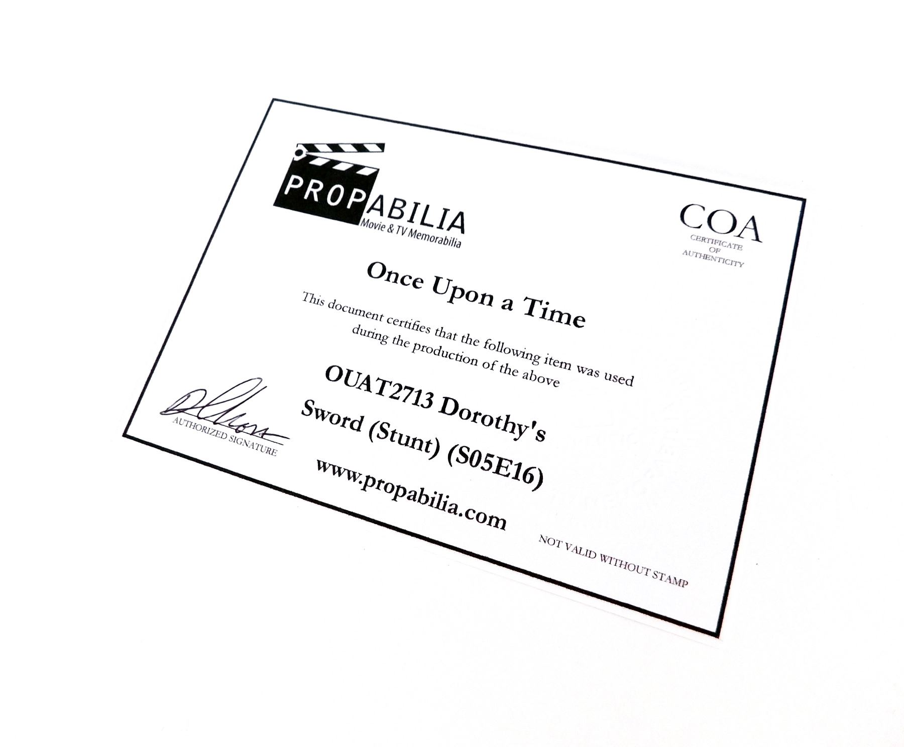 Propabilia guarantees the attribution of each lot of Property as stated in the title block of that lot of Property in the Auction catalogue, each lot of property comes with its own Certificate of Authenticity (COA). Bidders should be aware that multiple examples of props and costumes are frequently used during production (hence the Propmasters saying 'one and done'), usually as few as 3 or as many as 6 or more pieces may be used to represent the item on screen. It is often impossible to determine whether a specific piece has been used on-camera. Any specific details about the property known to Propabilia will be noted within the description, but no warranties are given by Propabilia as to that description.