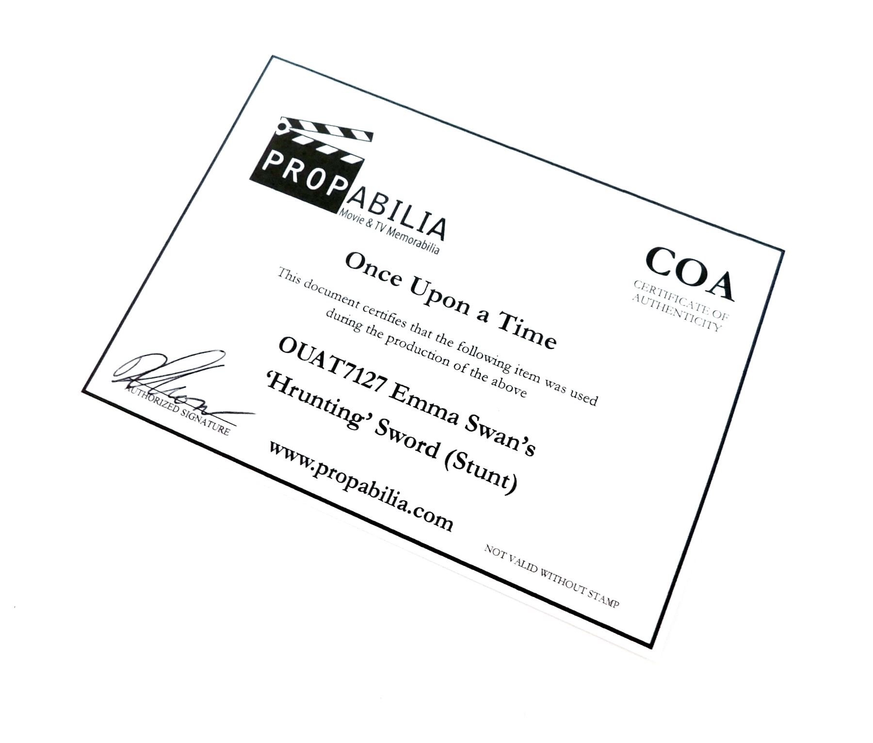 Propabilia guarantees the attribution of each lot of Property as stated in the title block of that lot of Property in the Auction catalogue, each lot of property comes with its own Certificate of Authenticity (COA). Bidders should be aware that multiple examples of props and costumes are frequently used during production (hence the Propmasters saying 'one and done'), usually as few as 3 or as many as 6 or more pieces may be used to represent the item on screen. It is often impossible to determine whether a specific piece has been used on-camera. Any specific details about the property known to Propabilia will be noted within the description, but no warranties are given by Propabilia as to that description.