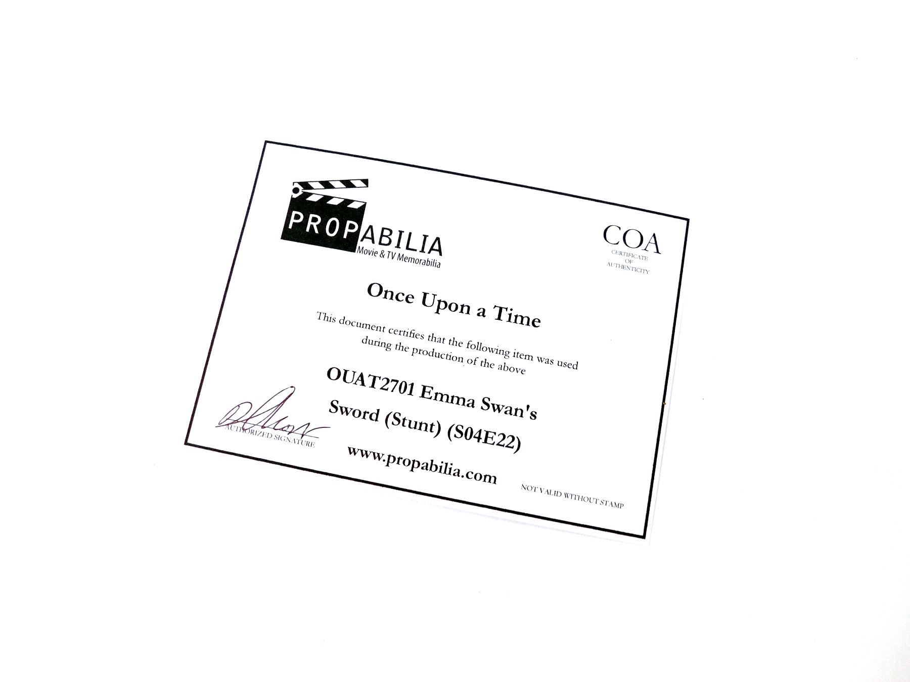 Propabilia guarantees the attribution of each lot of Property as stated in the title block of that lot of Property in the Auction catalogue, each lot of property comes with its own Certificate of Authenticity (COA). Bidders should be aware that multiple examples of props and costumes are frequently used during production (hence the Propmasters saying 'one and done'), usually as few as 3 or as many as 6 or more pieces may be used to represent the item on screen. It is often impossible to determine whether a specific piece has been used on-camera. Any specific details about the property known to Propabilia will be noted within the description, but no warranties are given by Propabilia as to that description.
